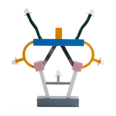 Ettore Sottsass, Ashoka, Painted metal table lamp. Early edition, superb object of functional design, beautiful on a large console or spacious side table, and crafted of lacquered metal. Its size, colorful elements, and dynamic, symmetrical silhouette create a one-of-a-kind sculptural artwork.