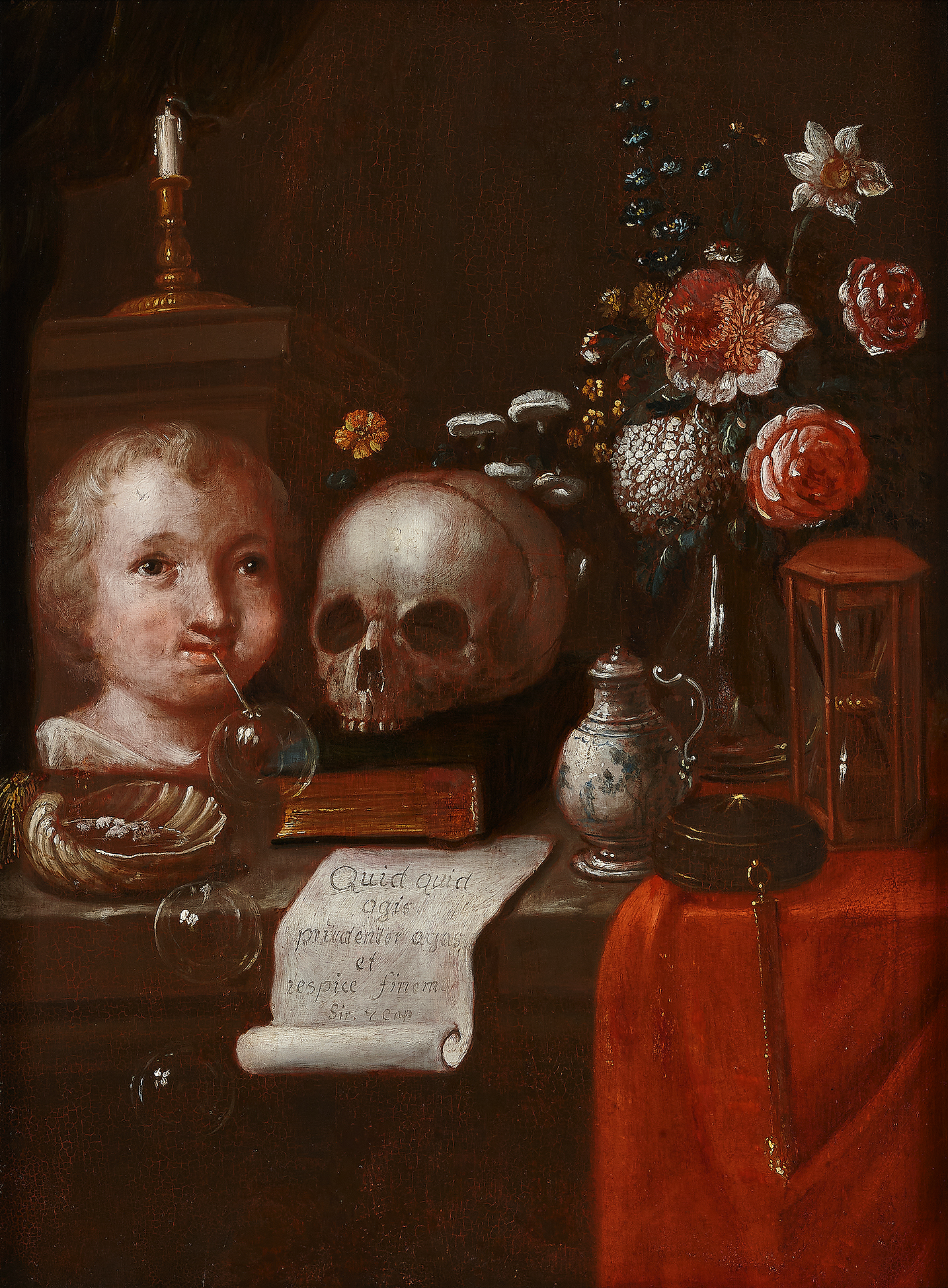 Here, we see a skull, symbolizing the ever-present finitude of every human being. The bubble-blowing boy alludes to youth, which is temporary, and life, which is like a beautiful soap bubble, but can burst at any moment. Other symbolism here that alludes to the transience of life is the hourglass, the extinguished candle, the flowers that are only beautiful and fresh for a short time, the mushrooms that grow only in the shade, and the watch turned upside down on the table.