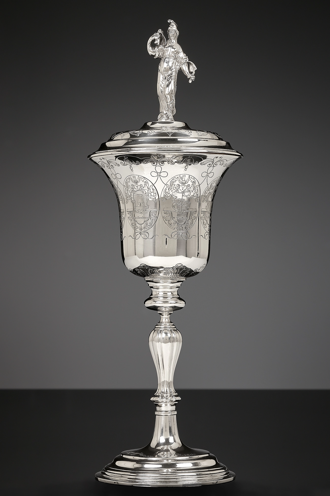 Ein Becher mit einem schlanken, balusterförmigen Sockel und einer glockenförmigen Kuppa, die von einer allegorischen Figur bekrönt wird. Die Kuppa ist mit sieben Wappen und Namen graviert. Diese Namen entsprechen dem Dekan und den Gildenmeistern der Schiffergilde in Schiedam im Jahr 1754. Eine spätere Gravur auf dem Sockel weist darauf hin, dass der Becher im 19. Jahrhundert Teil einer englischen Sammlung war.