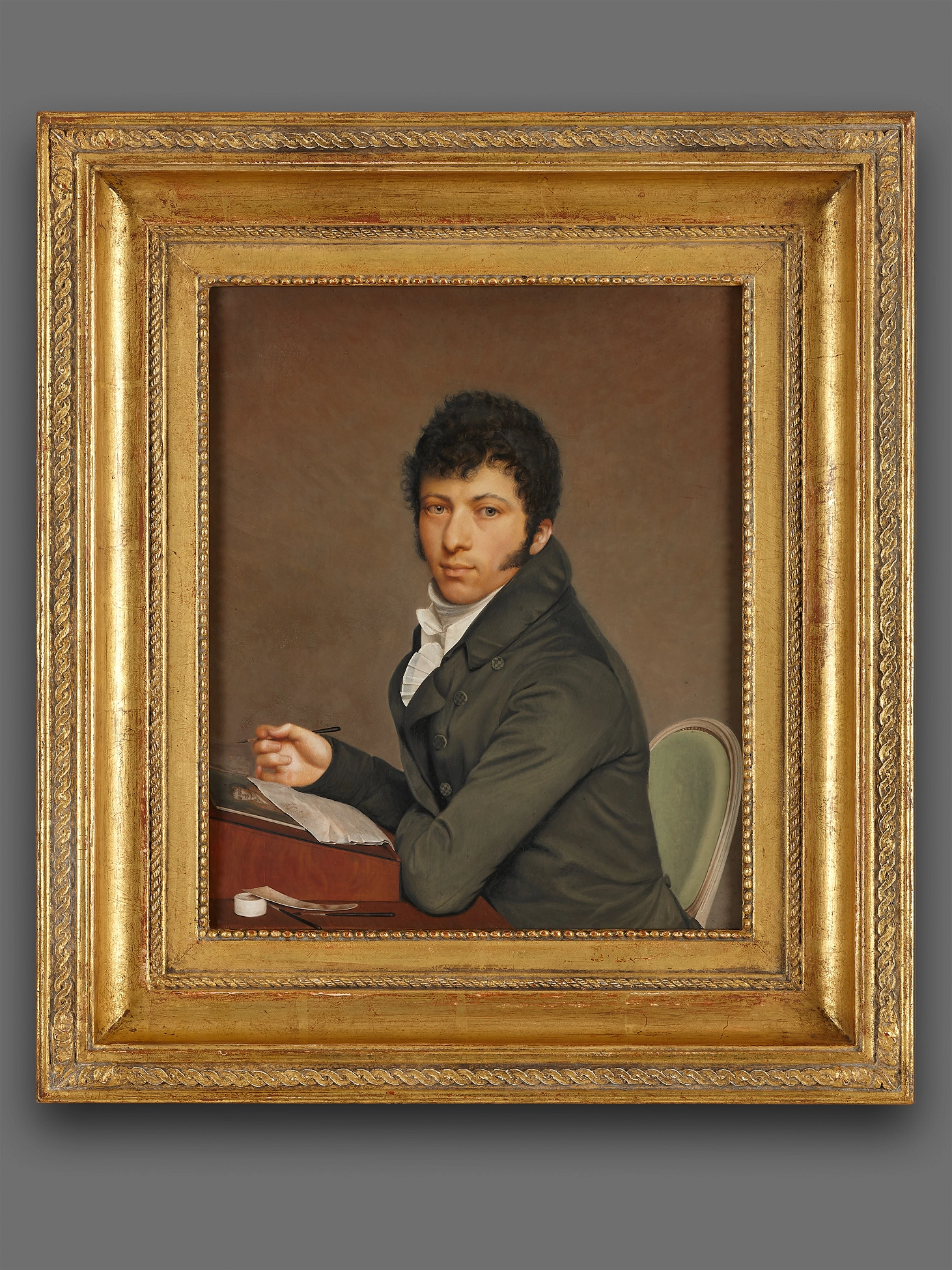 Dieses elegant gemalte Porträt zeigt einen jungen Mann, der an einem Schreibschatulle auf einem Tisch sitzt. Er lehnt sich auf den Tisch und hält in der rechten Hand ein Federhalter, mit der er einen Brief schreibt, der halb auf einem Männerporträt liegt. Neben dem Schreibschatulle befinden sich seine übrigen Schreib- und Malutensilien.
