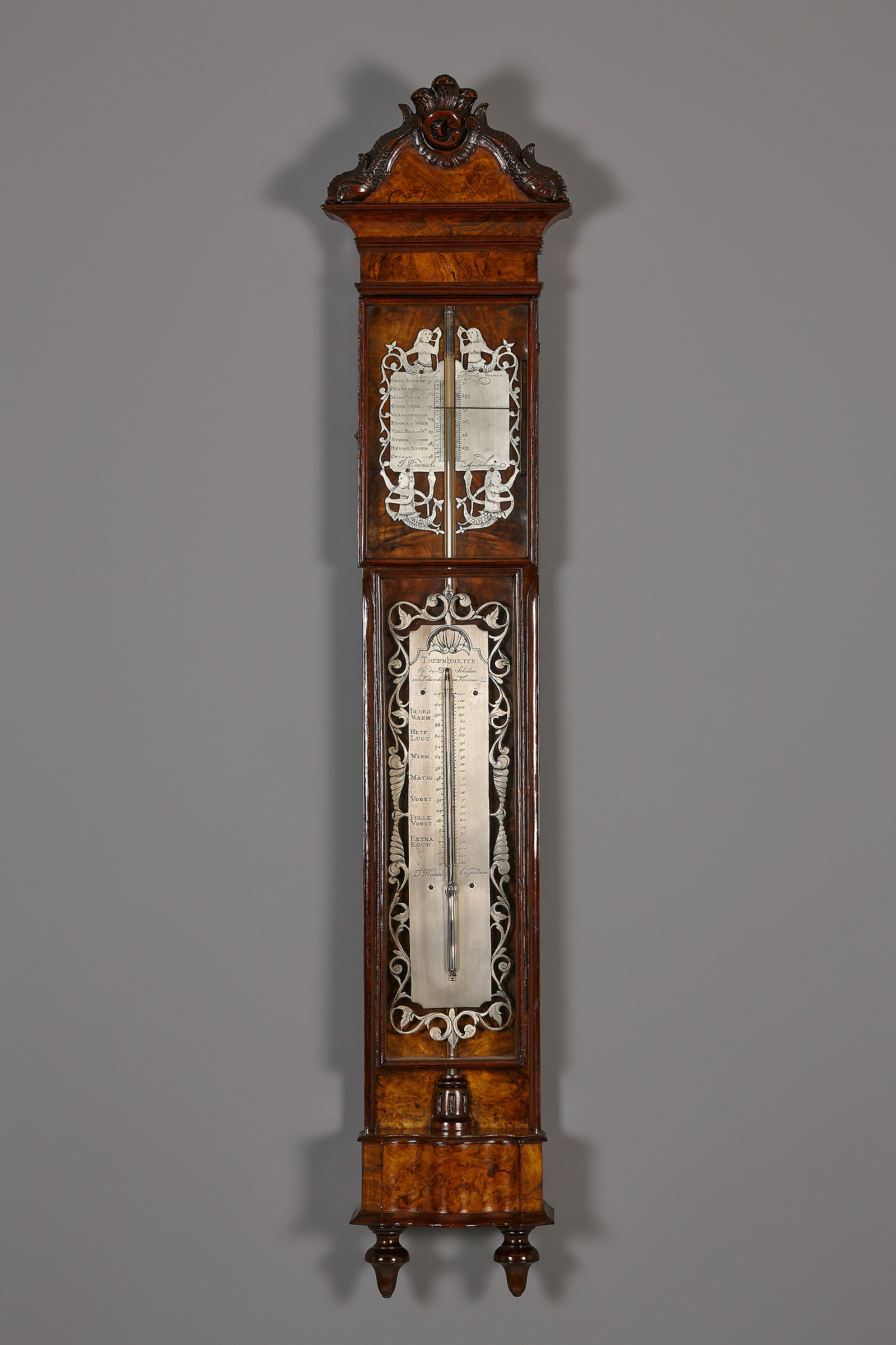 Baromètre hollandais dans un boîtier plaqué en ronce de noyer. Les plaques graduées en étain sont gravées et laquées en noir. Le baromètre est composé de deux fenêtres. La plus grande fenêtre se trouve en bas et montre le thermomètre contre sa plaque graduée avec une échelle en degrés Fahrenheit et Florence. Derrière, se trouve le contre-tube du baromètre, dont la plaque graduée se trouve dans une fenêtre au-dessus du thermomètre et dont l'échelle est graduée en pouces rhénans. La plaque graduée du baromètre porte la signature : Lurasco Spinelli & Comp Amsteldam.
