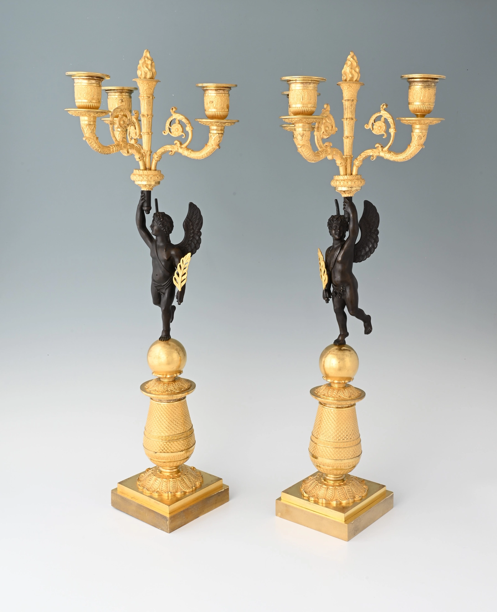 Quelques bougeoirs en bronze doré et patiné, avec un Cupidon ailé.