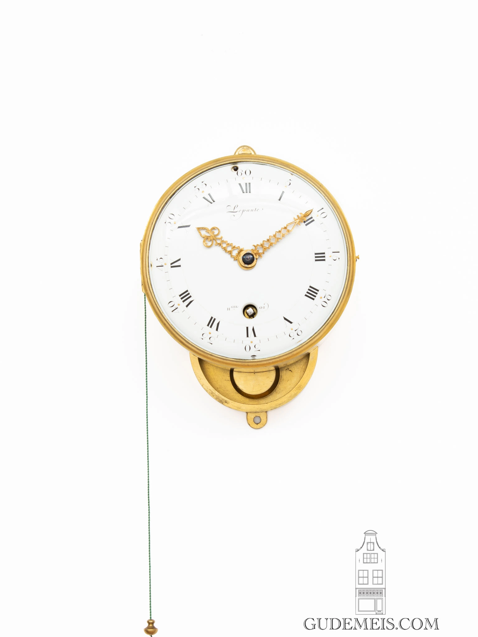 Le boîtier rond doré possède une porte profilée et au-dessous un petit réceptacle dans lequel le balancier se déplace. Le tout est suspendu au mur par un crochet de suspension.