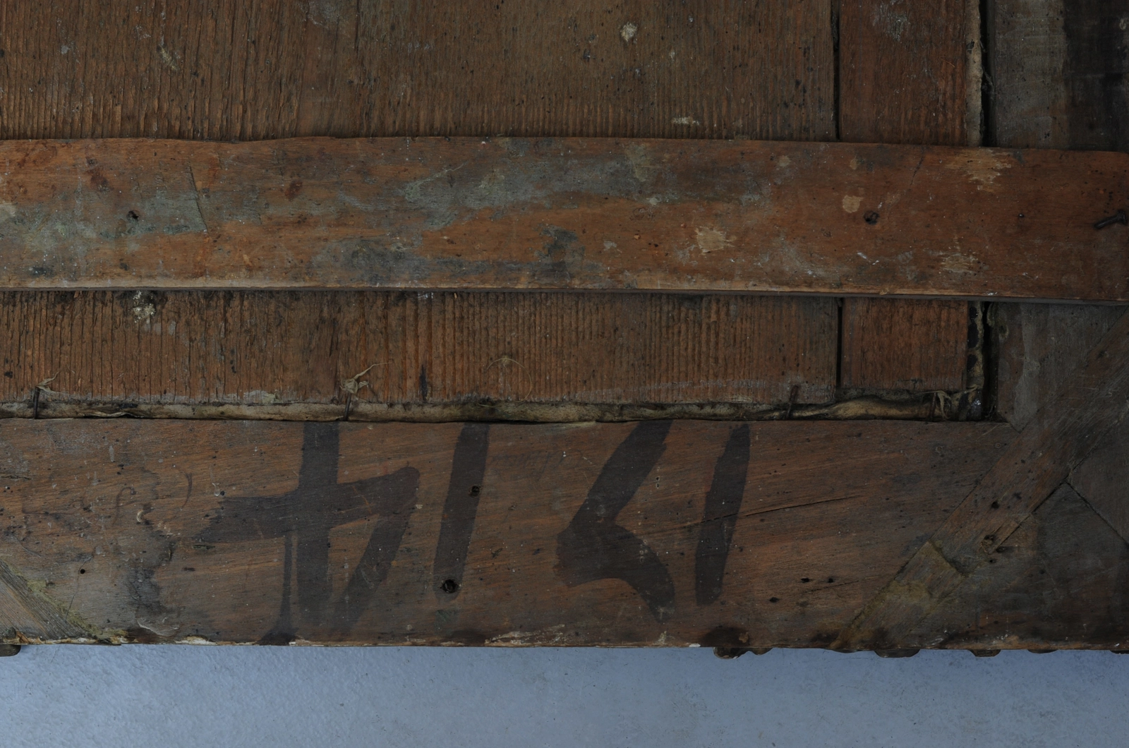 Een spiegel in houten lijst, mogelijk voormalig vertrek- en aankomsttijden lijst, ca 1880.