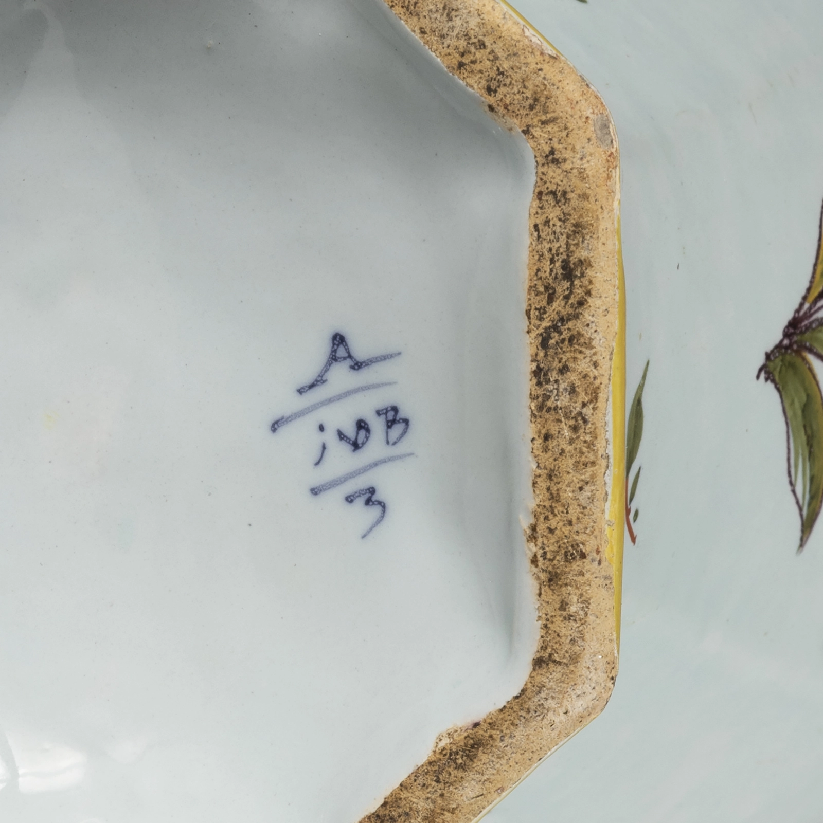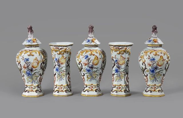 A Dutch Delft polychrome five-piece vase garniture decorated with Dutch tulips