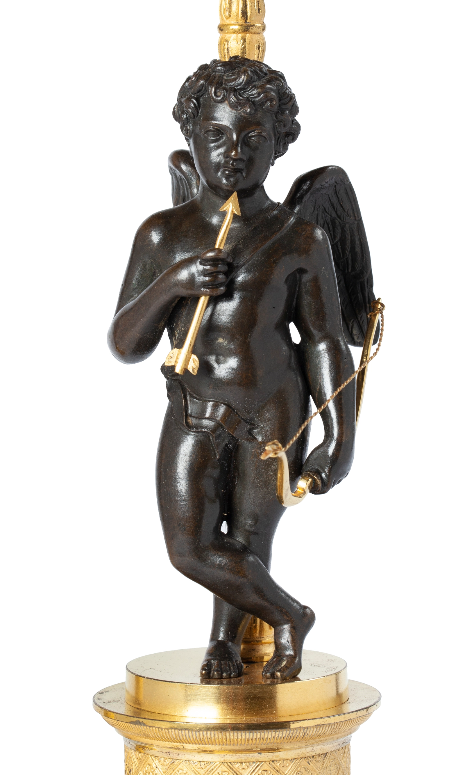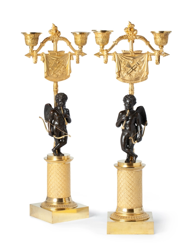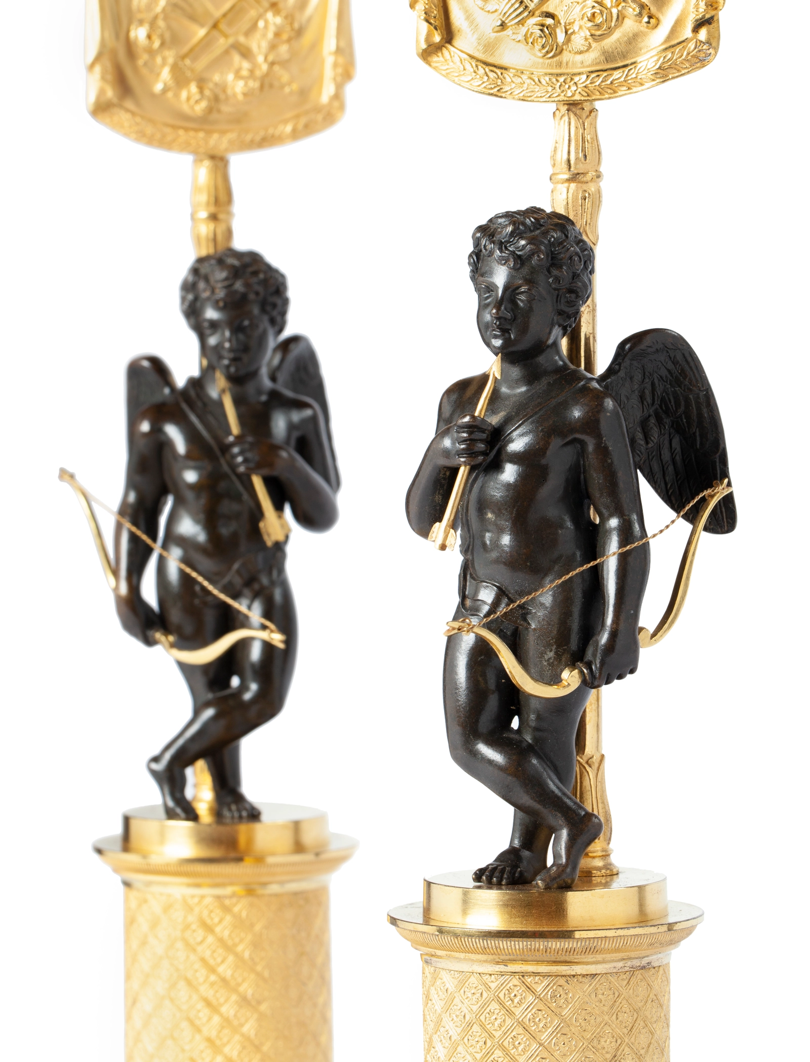 A stunning pair of French Empire gilt and patinated bronze five-light candelabra