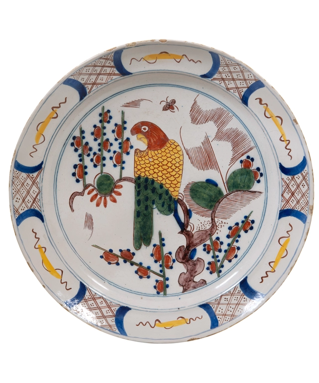 A Polychrome Dutch Delft Charger Depicting a Parrot