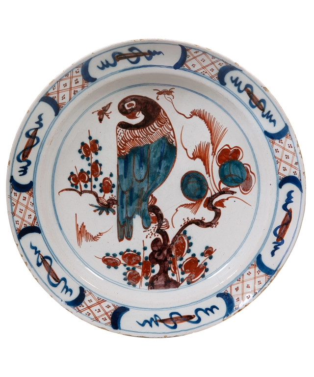 A Polychrome Dutch Delft Charger Depicting a Parrot