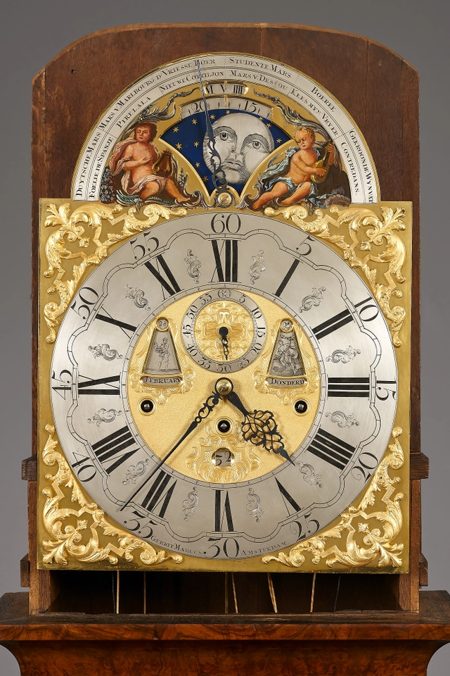 De wijzerplaat met verguld centrum en verzilverde gegraveerde ring toont de uren in Romeinse en de minuten in Arabische cijfers. De cijferring is op de hoeken geflankeerd door verguld bronzen ajour hoekstukken. Onder de XII bevindt zich een secondering. Boven de VI bevindt zich de datumaanduiding. In de toog centraal geplaatst een maanstandaanduiding binnen een geschilderd vlak met een voorstelling van musicerende putti. Hierboven in een halve boog, gelijk lopend met de toog worden de twaalf gespeelde melodieën genoemd. Middels een wijzer is handmatig de keuze voor een tweetal melodieën bepaald worden. De klok is gesigneerd op de cijferring: Gerrit Marcus Amsterdam.