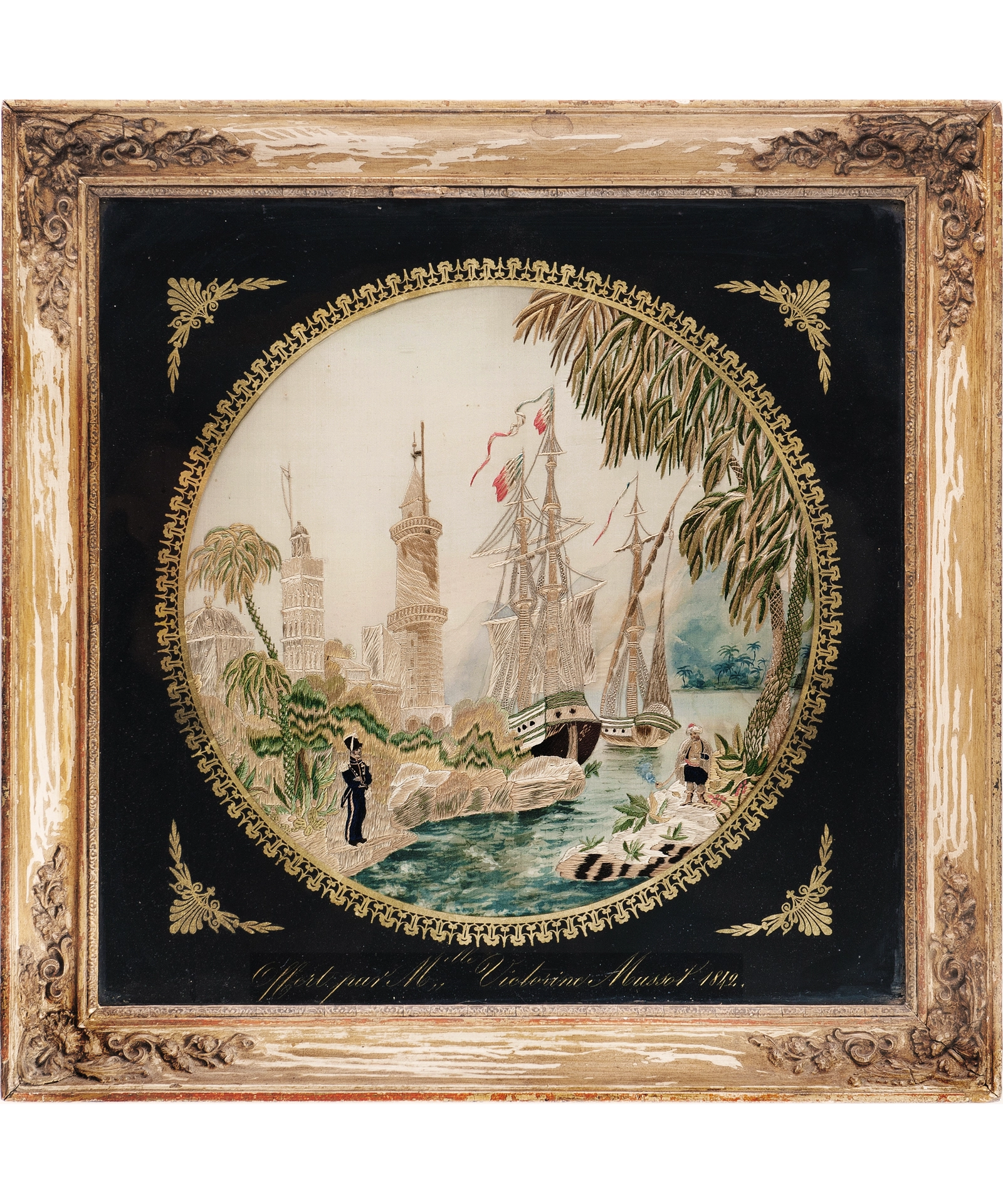 An Eglomise Framed Needlework Panel, with Oriental Scenery and French Ship
