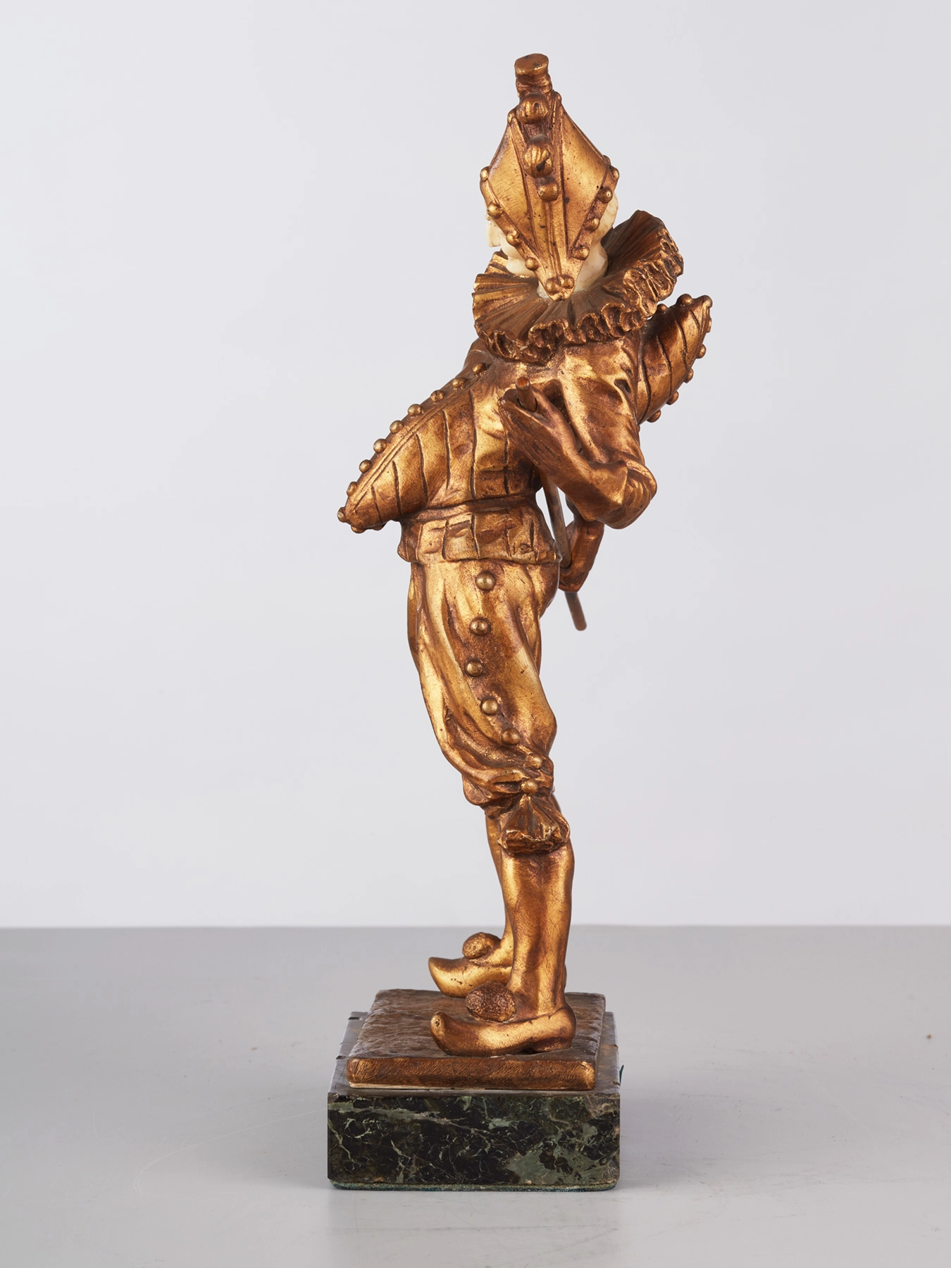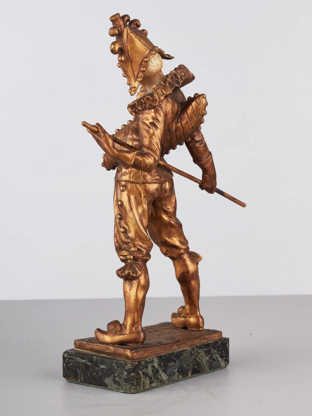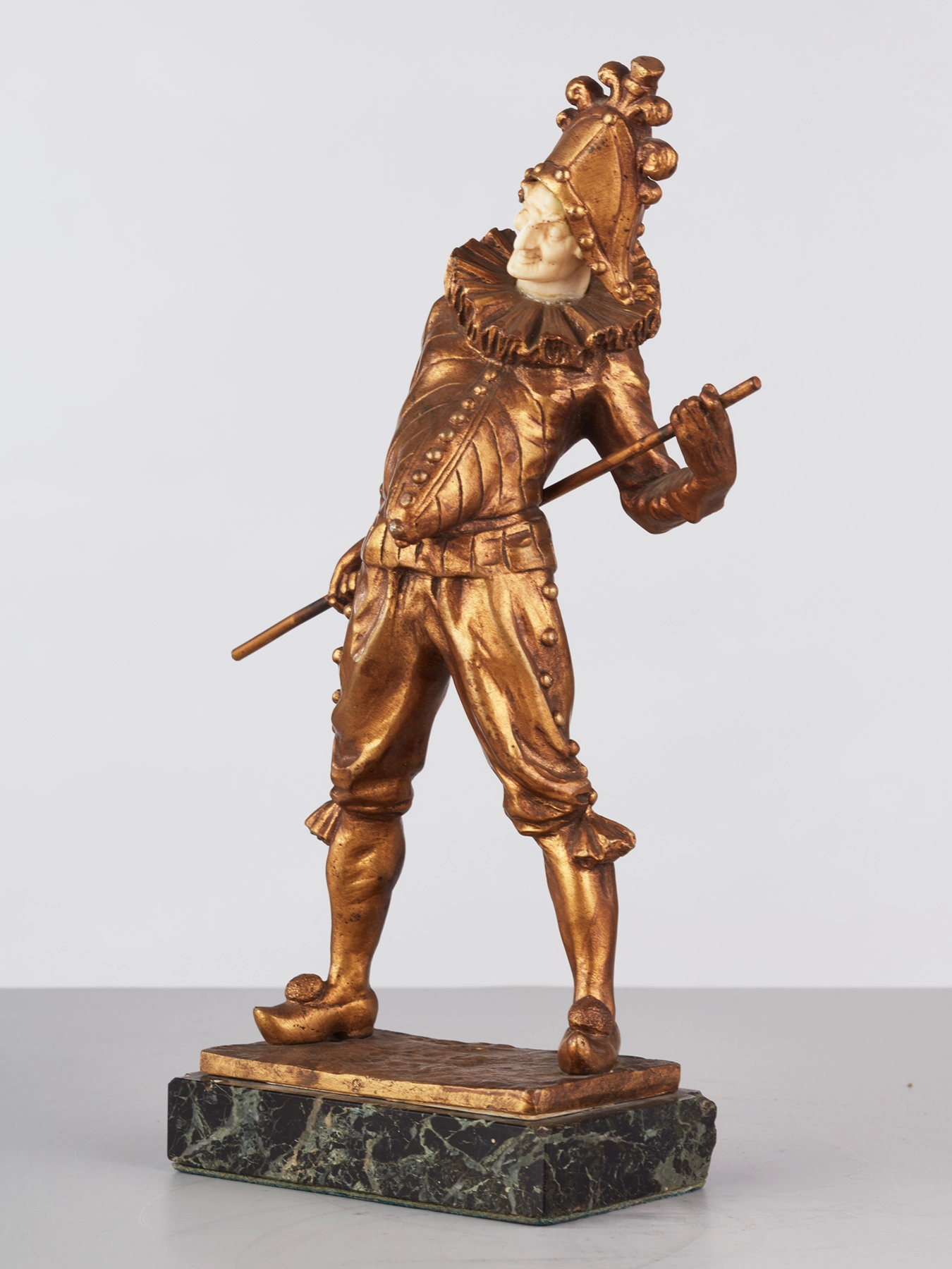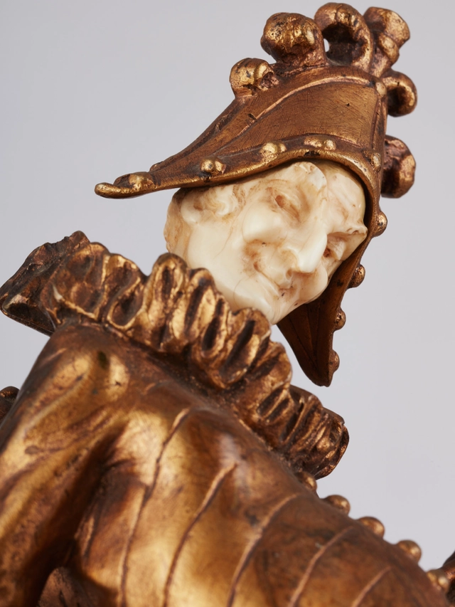 Een kleurrijk houten beeldje van gebochelde man met prominente knopen op jas, omstreeks 1850
