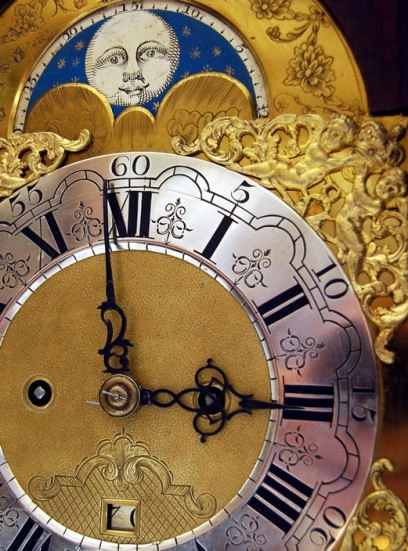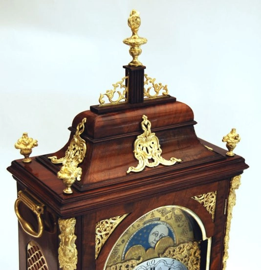 Een Hollandse wortelnoten staande klok met speelwerk, door Gerrit Storm, omstreeks 1735