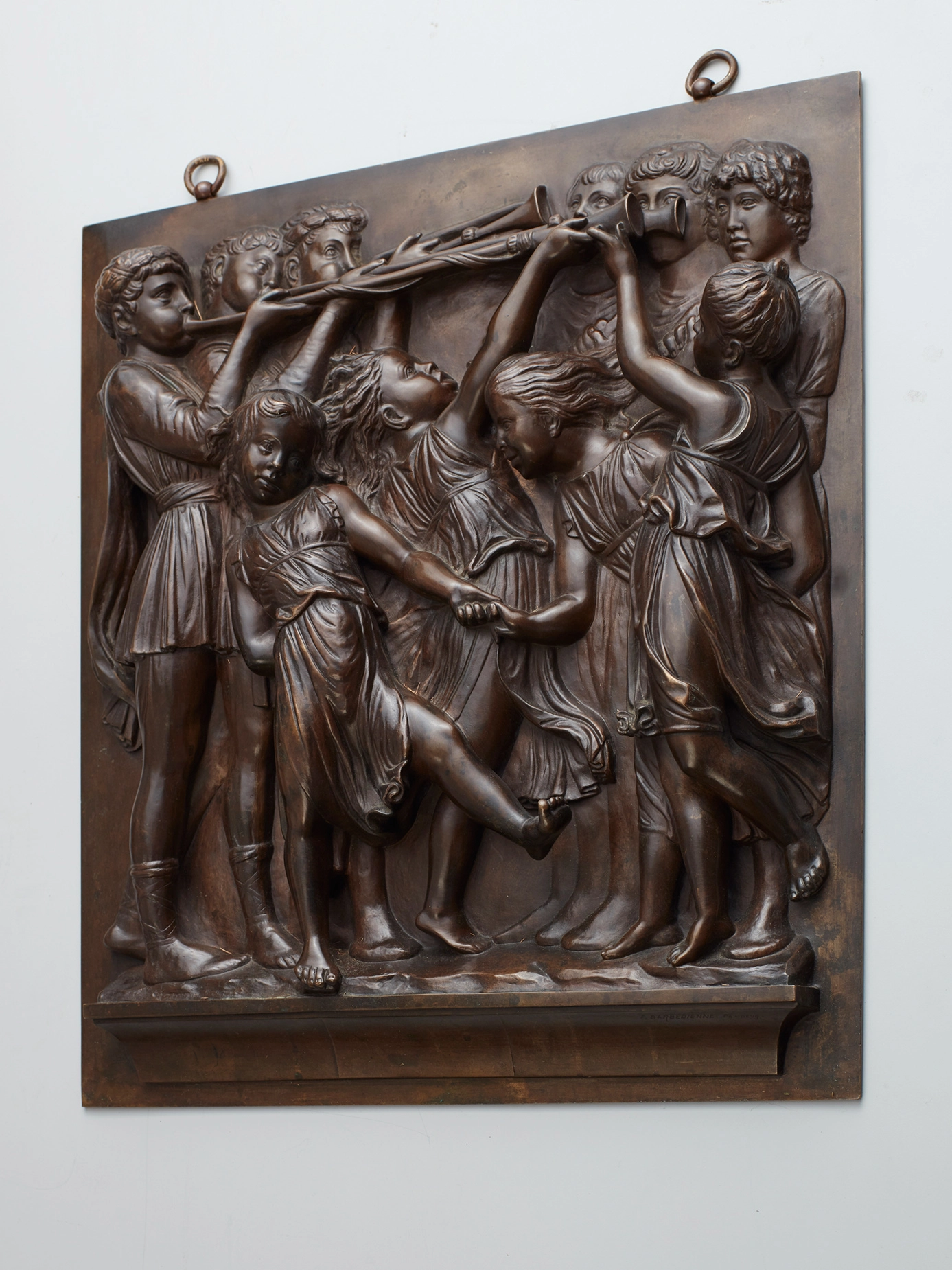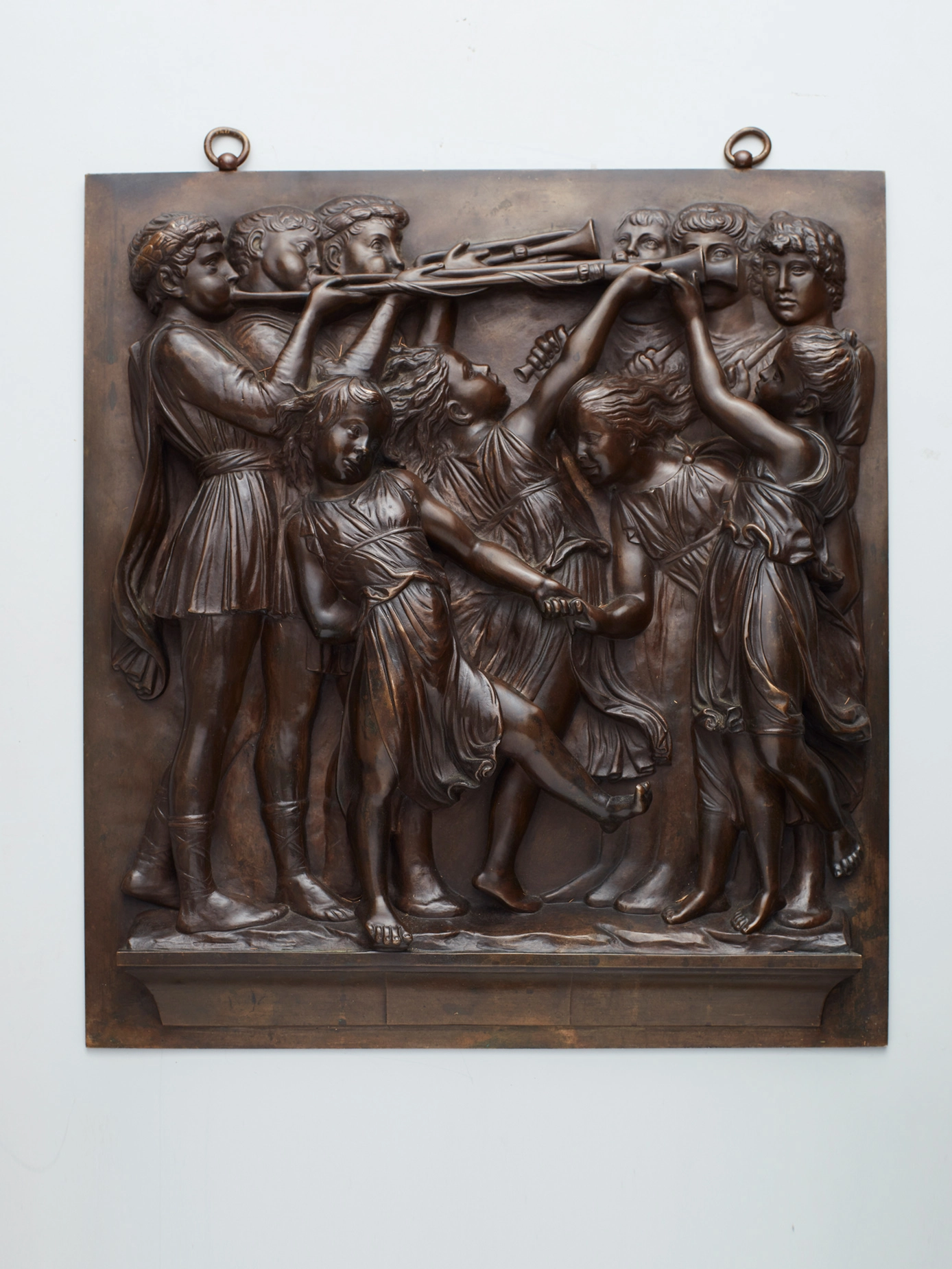 Een imposant paar bronzen Atlassen in hoog reliëf, omstreeks 1925