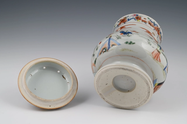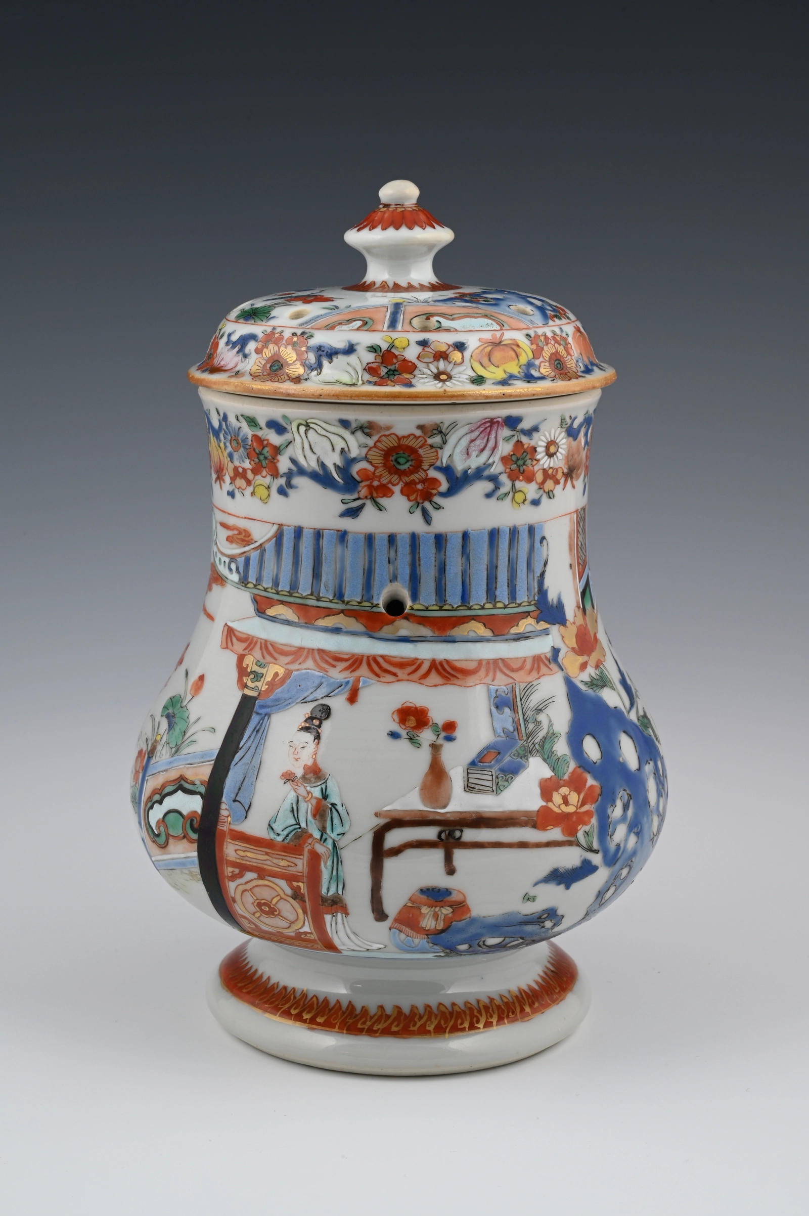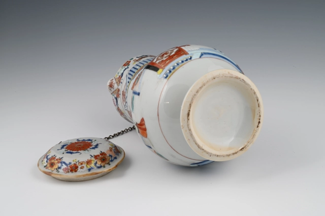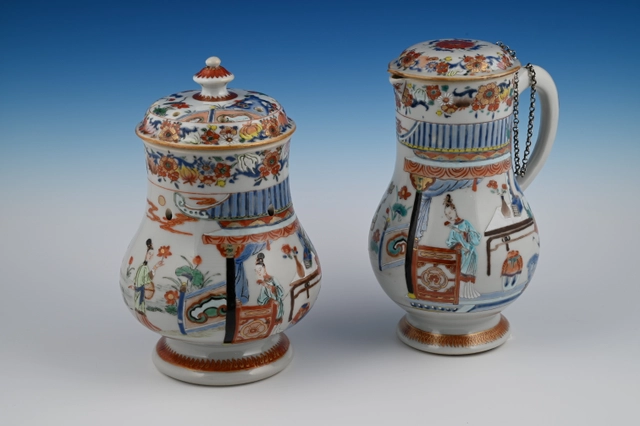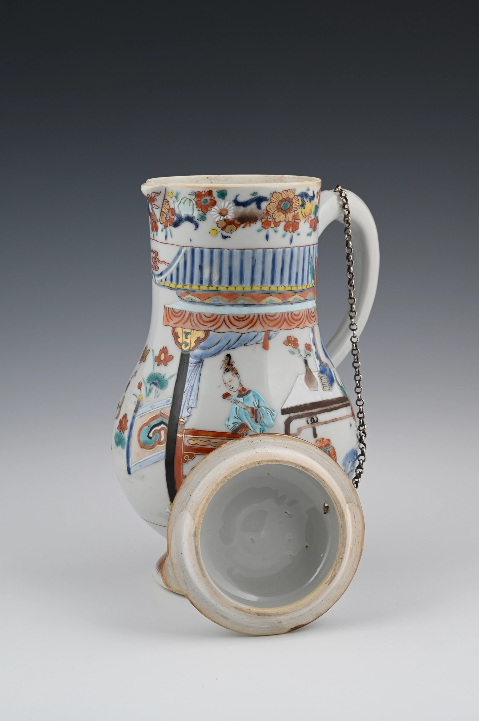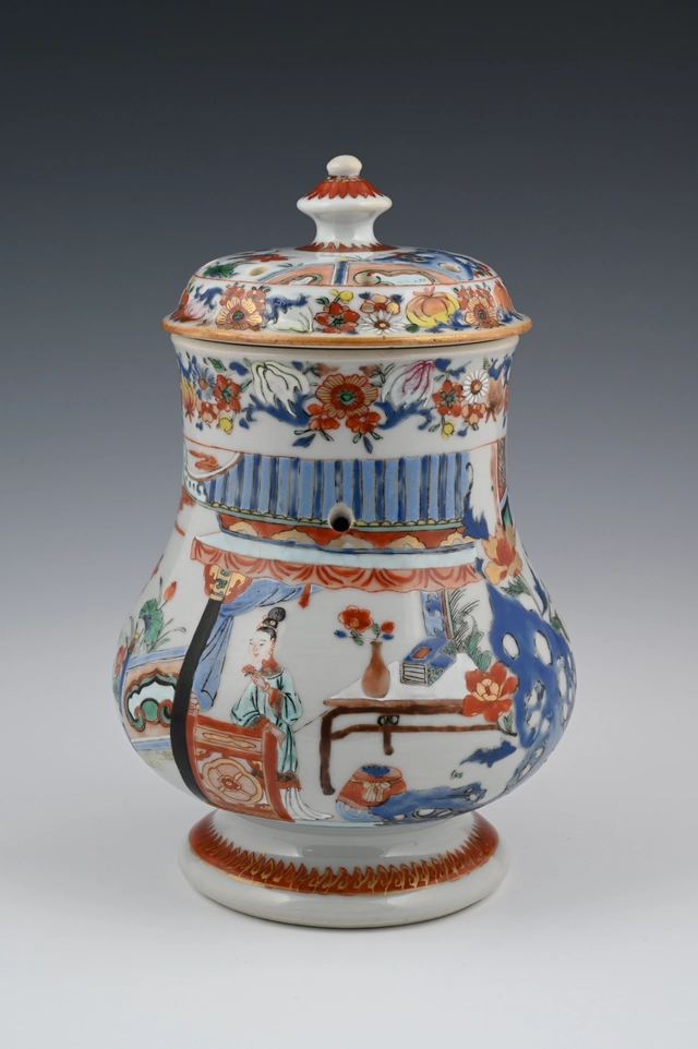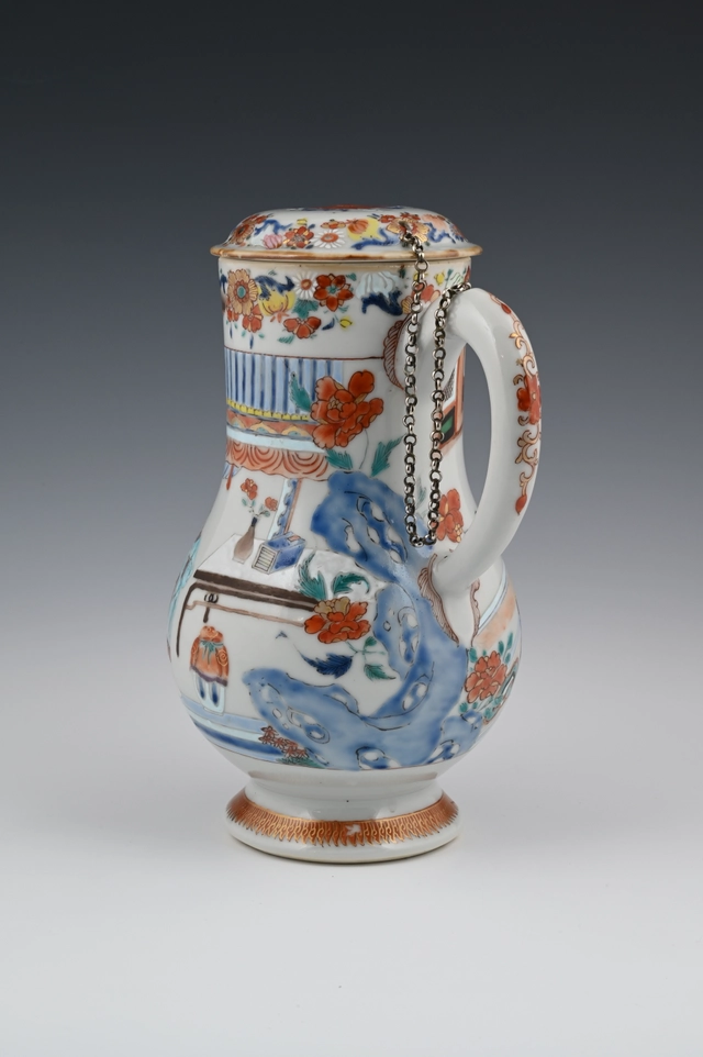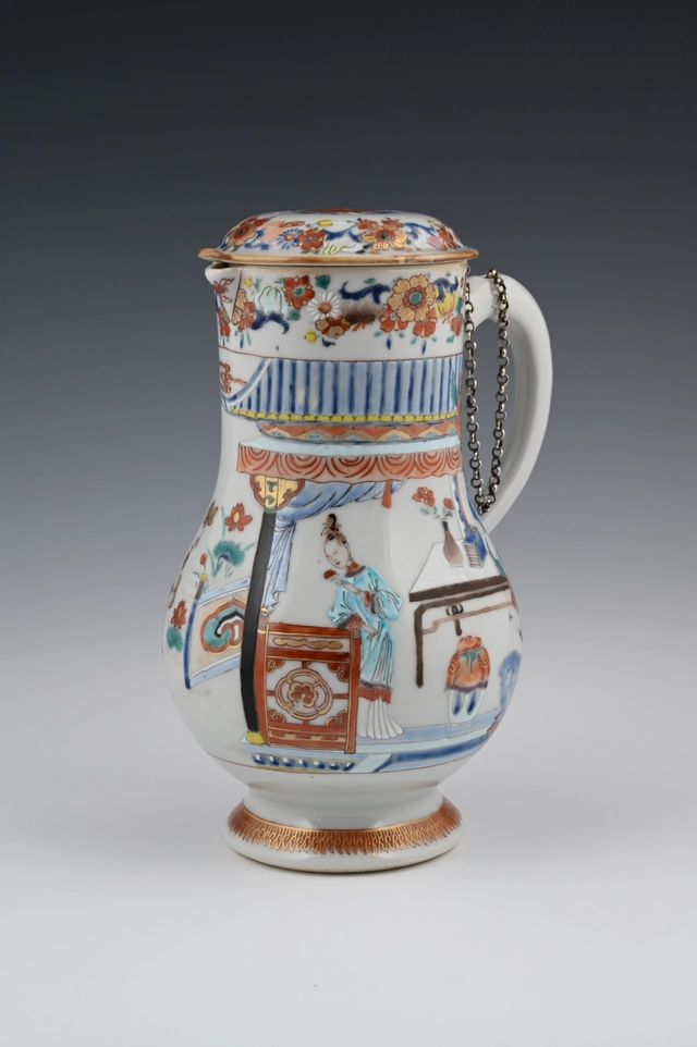 De kan is gemaakt naar Europese voorbeeld van een zilveren of aardewerk kan met een plat deksel en driehoekige tuit. Ook de bloemenslingers op de rand en deksel wijzen naar die invloed.