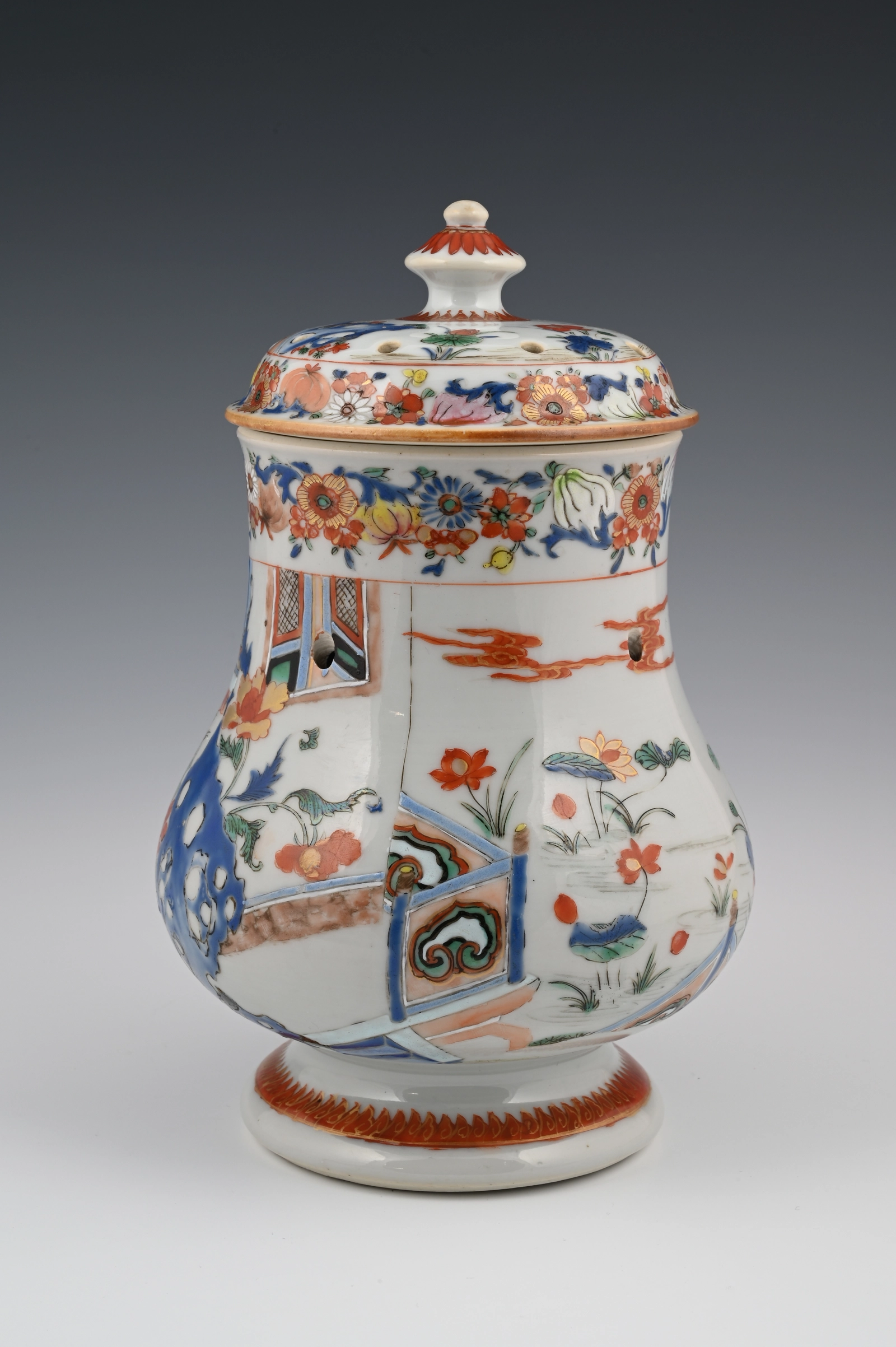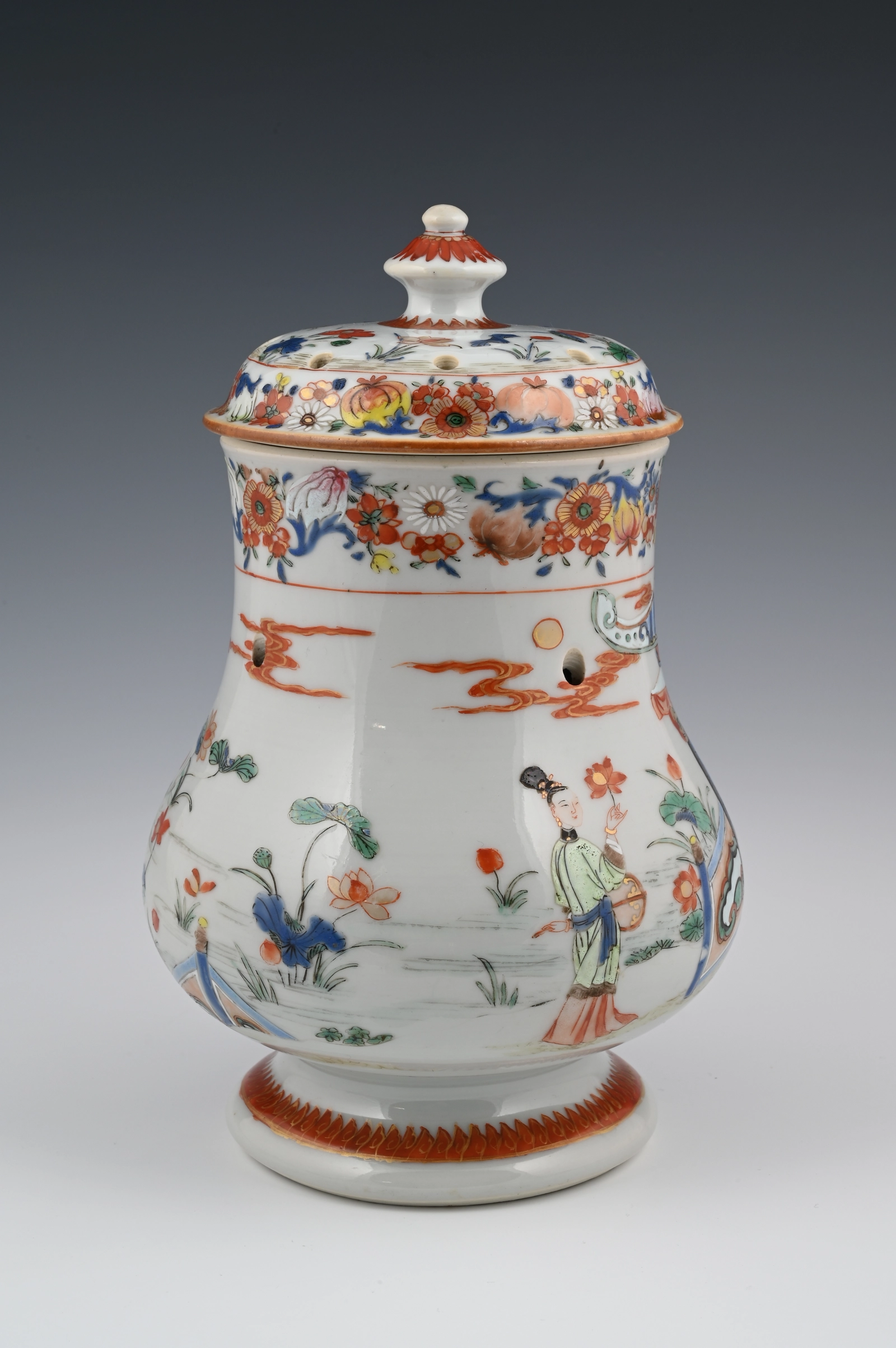 Een zeer fraai gedecoreerde Famille Rose potpourri set met een voorstelling van "Lange Lijzen" die bewonderend kijken vanuit een paviljoen en terras naar een rivier met bloeiende lotusbloemen.