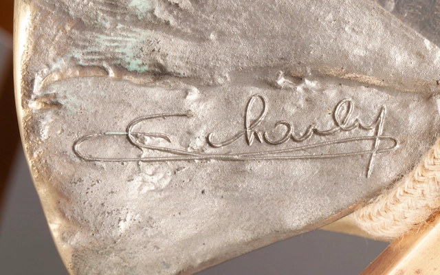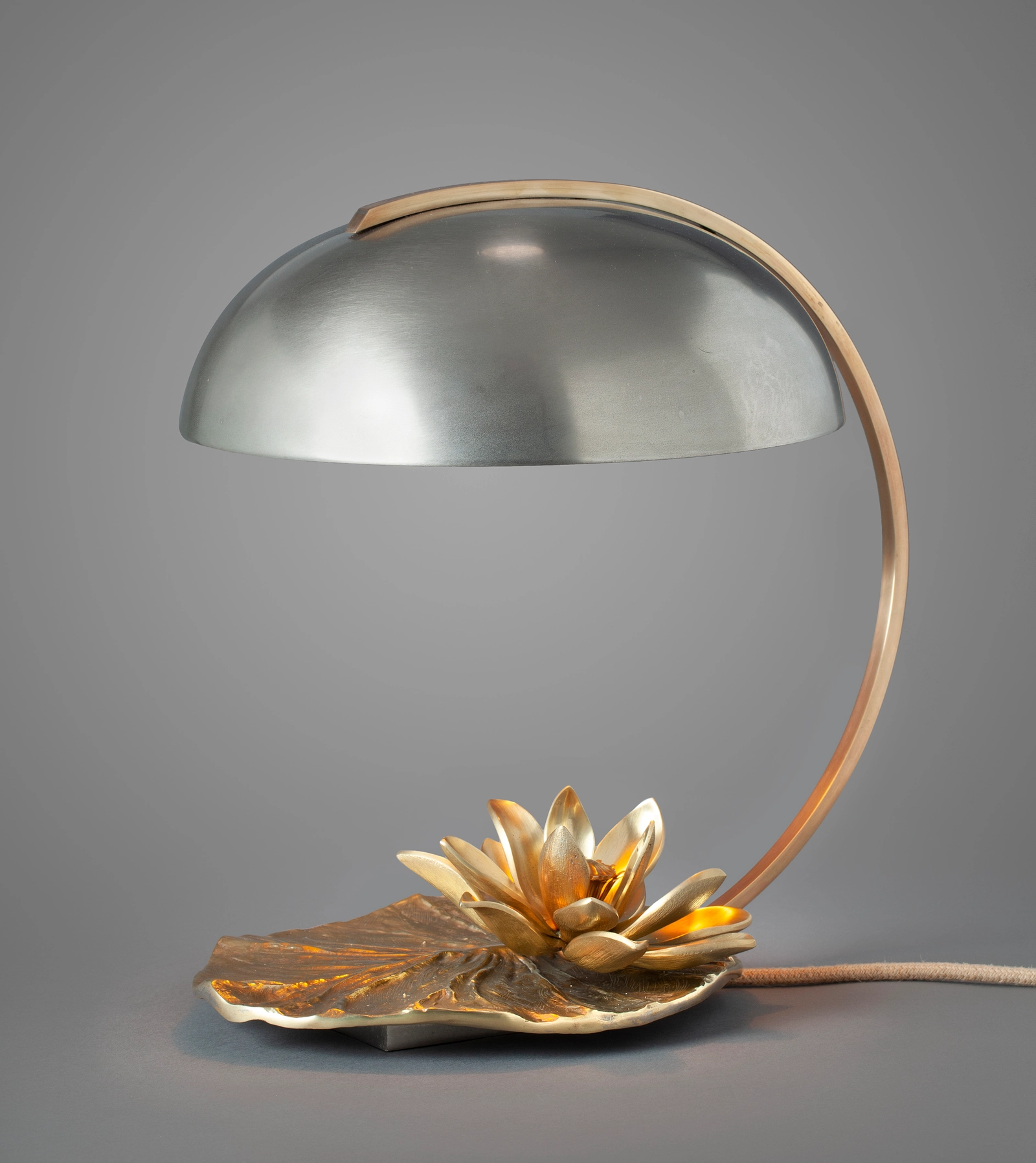 A beautiful “Nenuphar Coupele” table lamp designed by Chrystiane Charles. The lamp is signed on the base C. Charles. Chrystiane Charles is recognized as one of the foremost creative bronze artists and sculptors in the field of lighting of her generation. Born in 1927 her early creative years were spent with Gimont, Janniot and Saupique until joining her husband (Jean Charles)’s family business, Maison Charles et fils in the late 1950’s. Chrystiane Charles was involved with Maison Charles for nearly twenty-five years (1959-1982), during which time she served as designer then President and also for a period helped develop the Charles spirit as its artistic director.