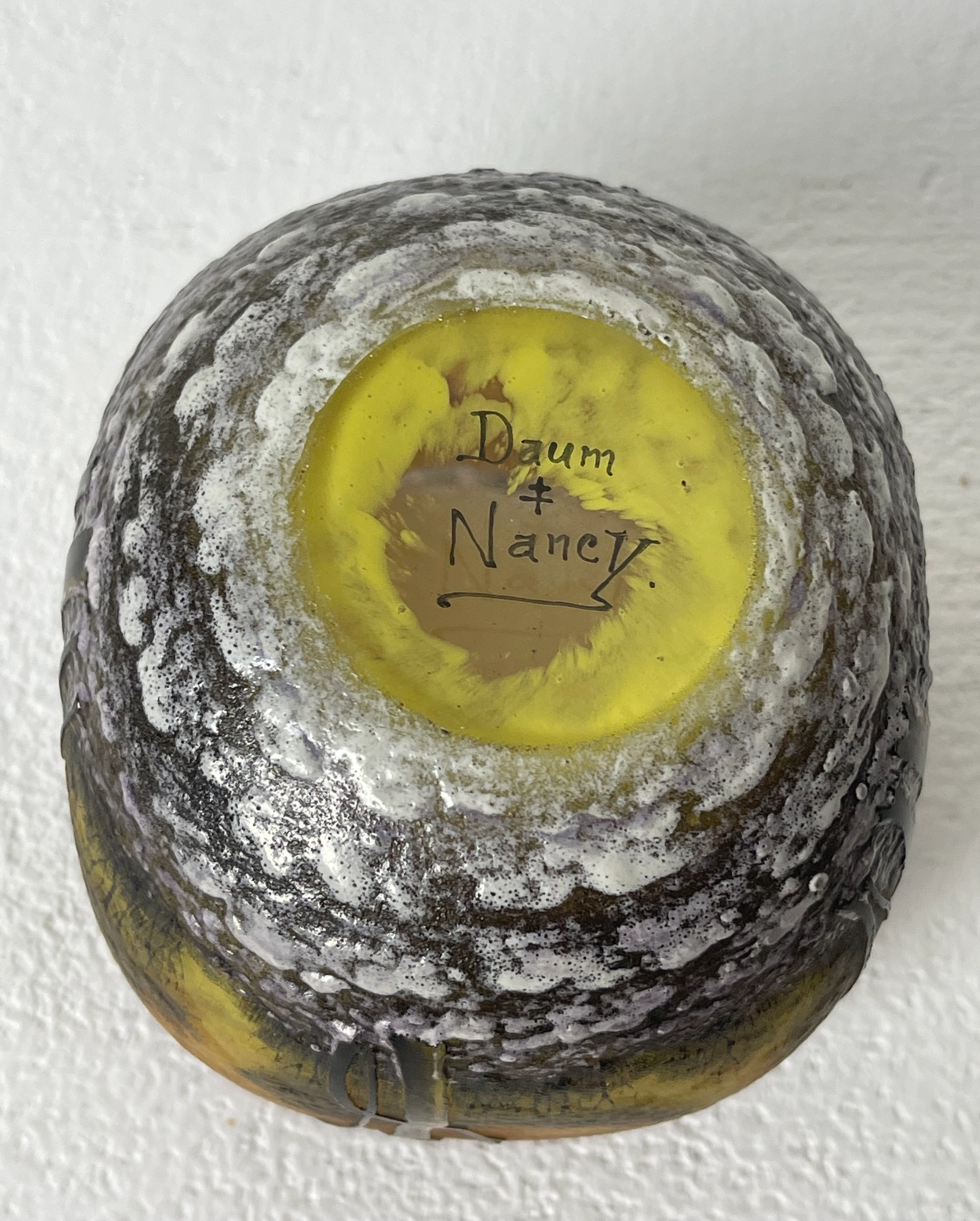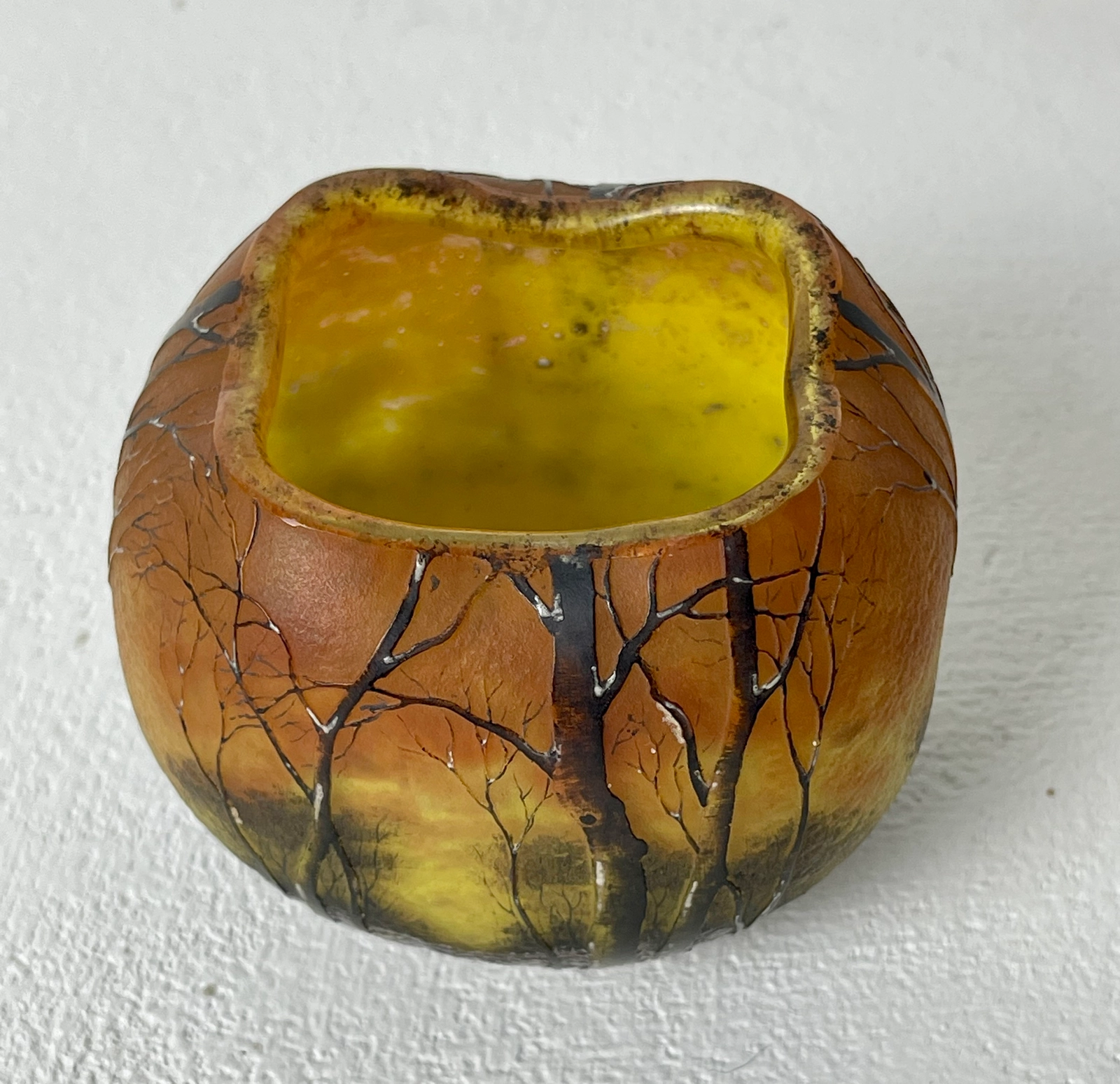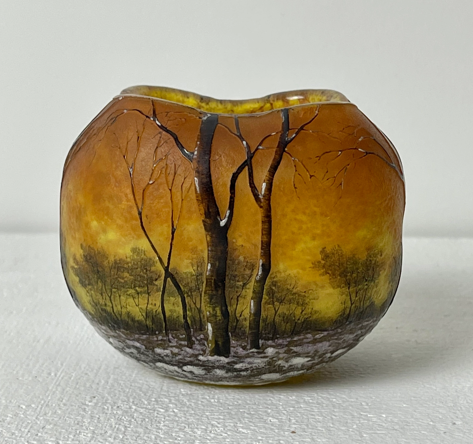 Daum Nancy - Een vaas met een winterlandschap. Met een buitengewoon verfijnd geëtst en geëmailleerd decor van bomen bedekt met sneeuw.