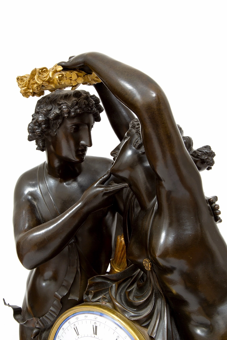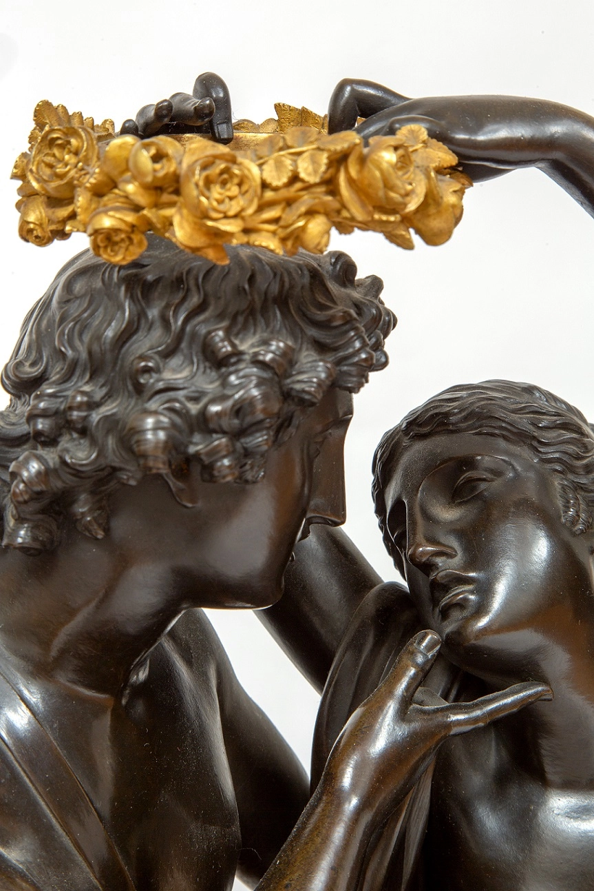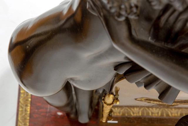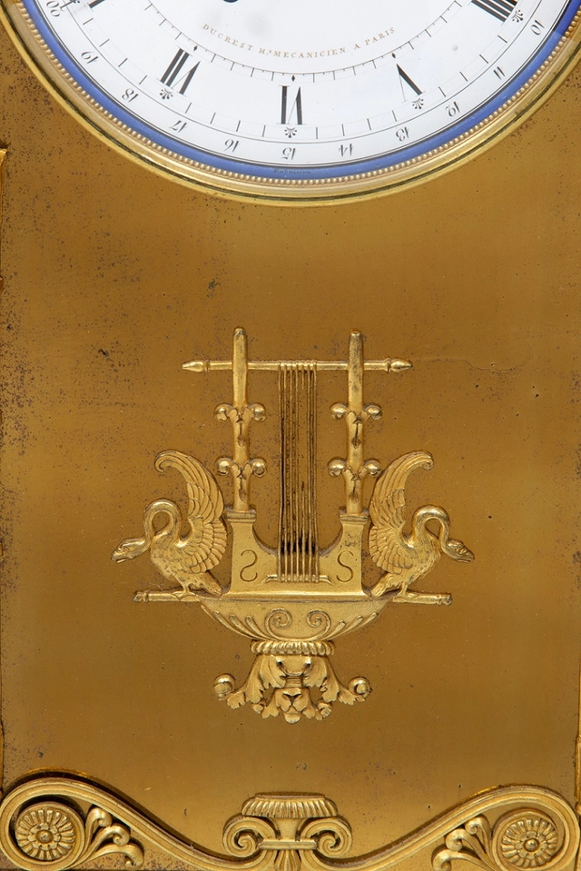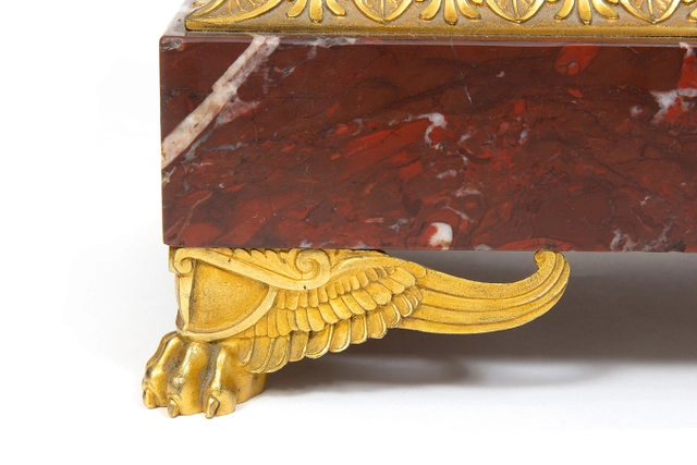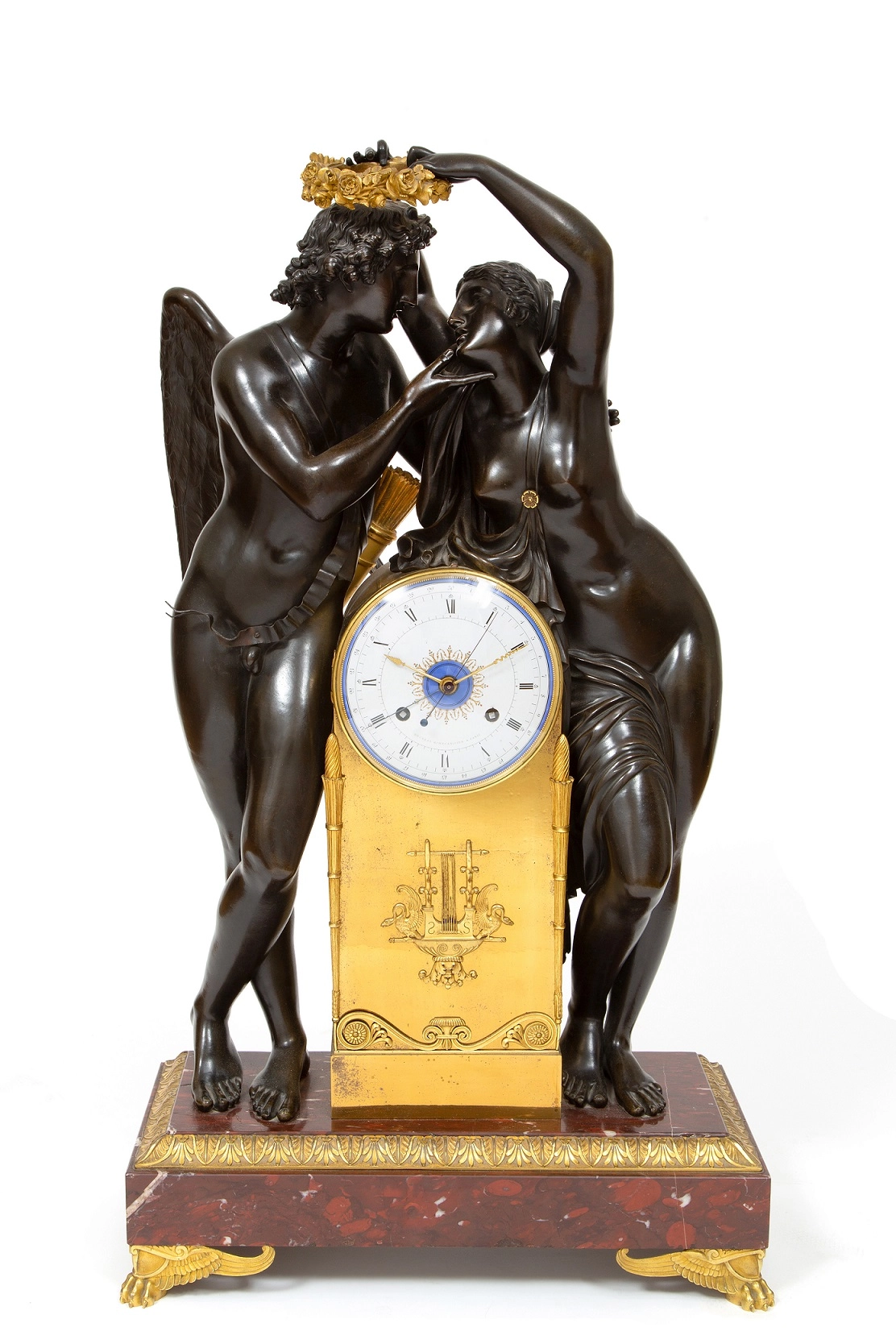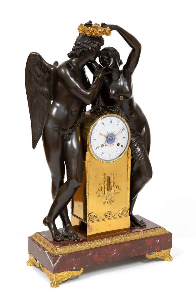 De vergulde kast van het uurwerk heeft een fraaie reliëf van een lier en wordt geflankeerd door twee zeer fraai gegoten en geciseleerde figuren. Een mannelijk naakt met vleugels personifiërend Amor. Ernaast staat een vrouwelijk naakt dat Psyche voorstelt en een lauwerkrans boven het hoofd van Amor houdt. Het geheel is geplaatst op een rechthoekige griotte rouge marmeren voet met acanthus reliëf omranding en fraaie gevleugelde klauwpoten.