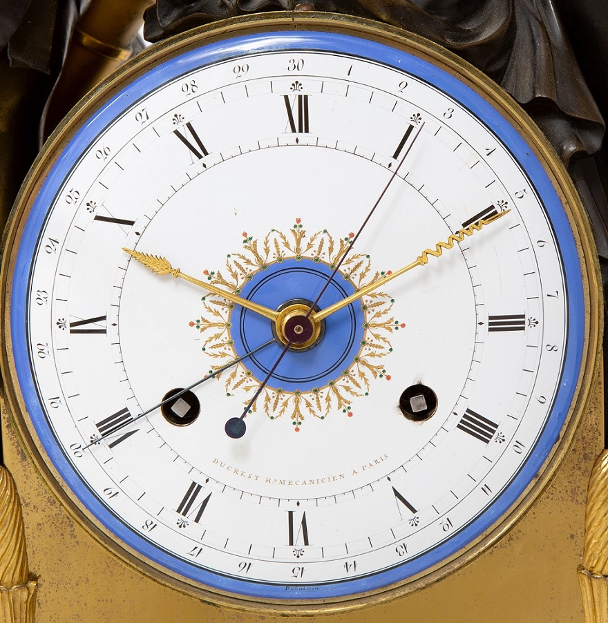 De 15-cm brede wijzerplaat is een kunstwerk op zich en is gesigneerd door de emailleur Dubuisson. De binnenzijde van de blauwe omranding is genummerd 1-30 voor de (revolutionaire) datum die wordt aangeduid met een strakke geblauwd stalen wijzer. Verder naar binnen is een rand genummerd die per vijf de minuten aangeeft. Weer verder naar binnen staan de Romeinse cijfers voor de uren. Zowel de minuten als uurwijzer is gemaakt van verguld messing en zeer uitzonderlijk van vorm. Tenslotte is er een rand gecallibreerd met streepjes voor de halve seconden die aangewezen worden met een geblauwd stalen wijzer. In het midden is een blauwe cirkel die versierd is met vergulde guirlandes en bloemen waarop weer doorzichtige emaillen punten. Tenslotte is de wijzerplaat in goud gesigneerd DUCREST Hr MECANICIEN A PARIS.