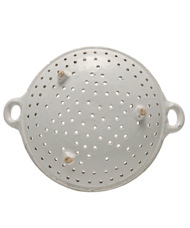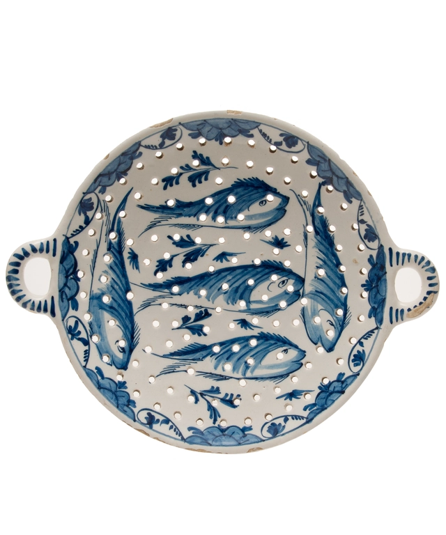Een Blauw en Wit Rond Visvergiet in Delfts Aardewerk