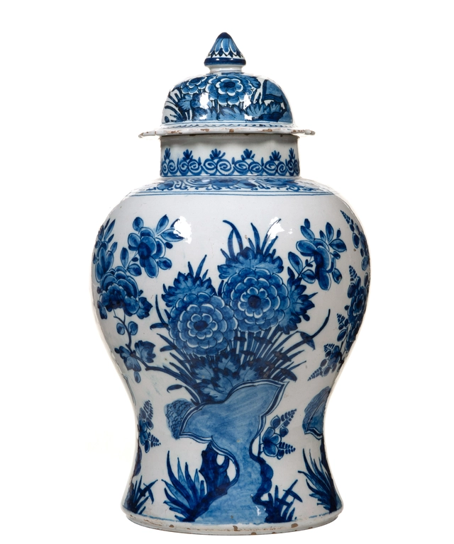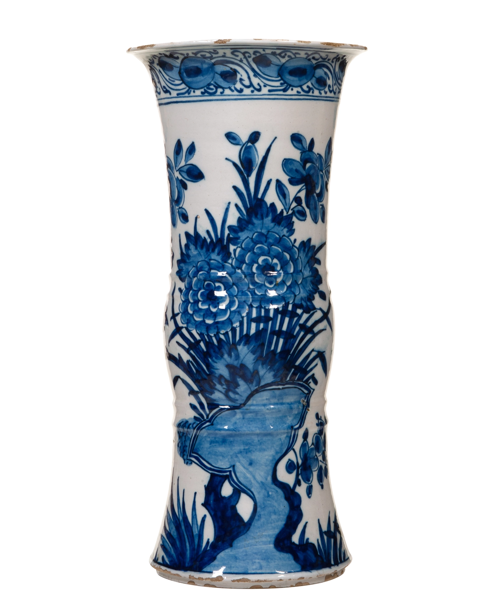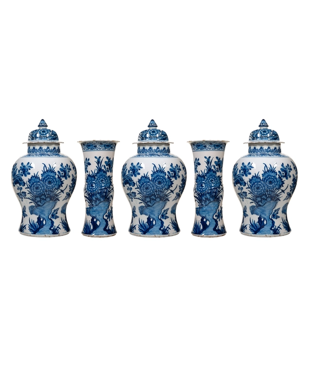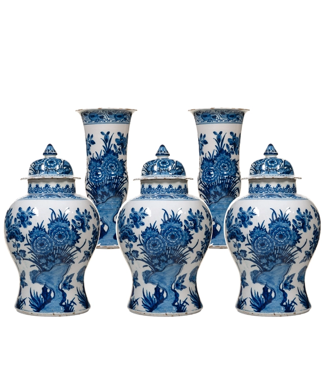 Een Blauw en Wit Vijfdelig Kaststel in Delfts Aardewerk