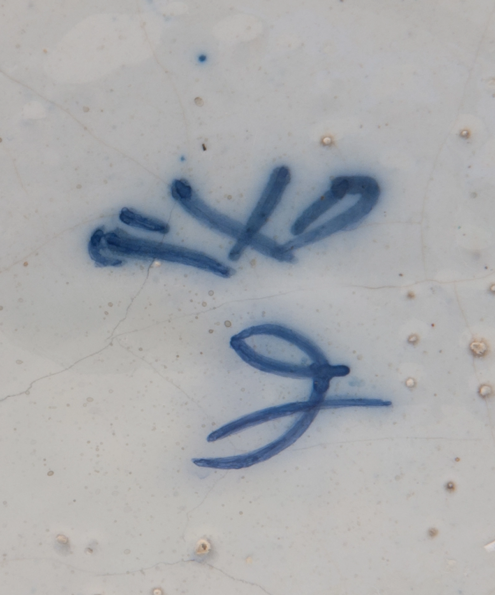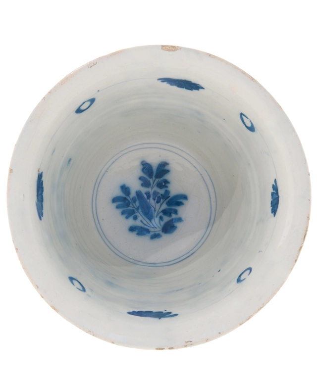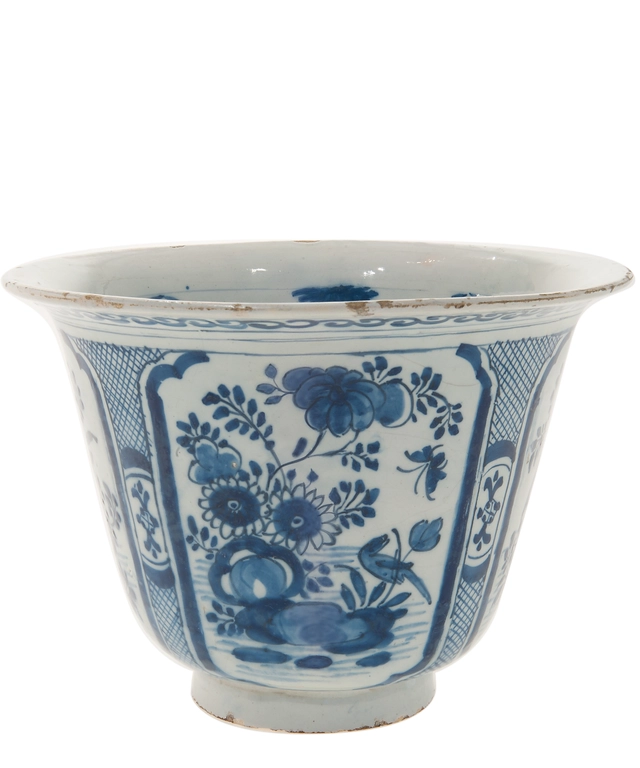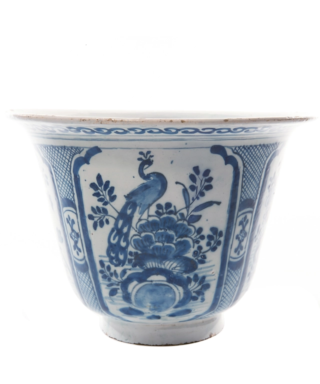 De klokvormige kom met standring is aan de buitenkant gedecoreerd met een Chinoiseriedecor van een paradijsvogel in cartouches. De decoratie is afgesloten door banden.