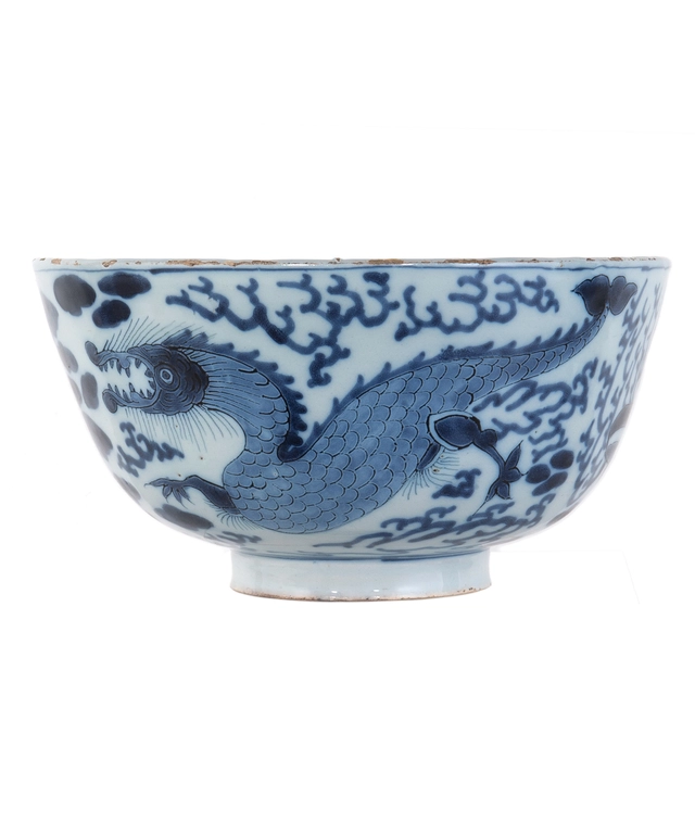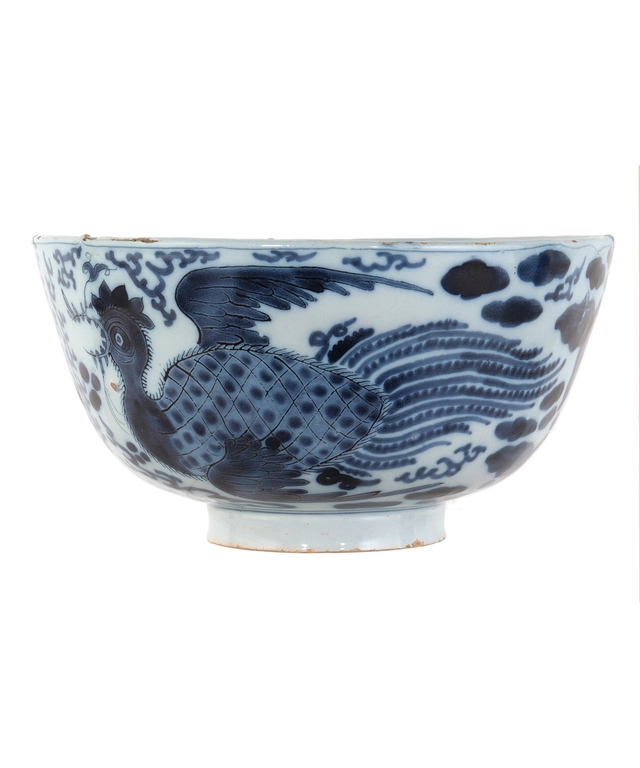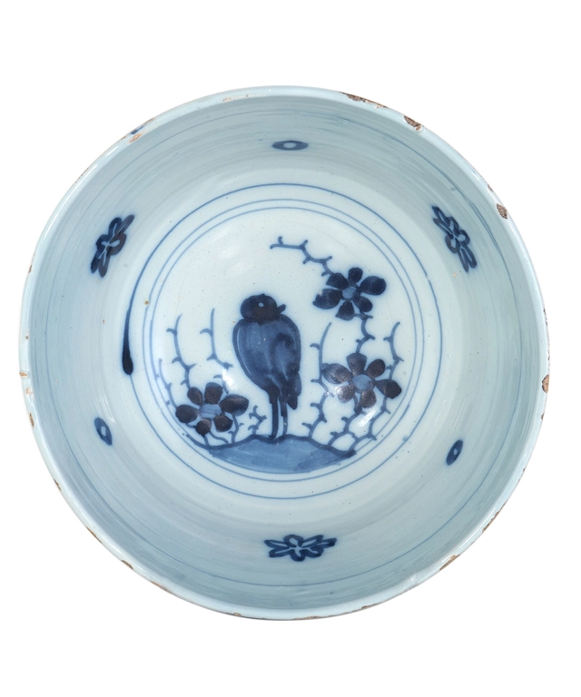 De binnenkant van de kom toont een vogel op een rots in een ring van dunne banden van blauwe lijnen en bloemkoppen