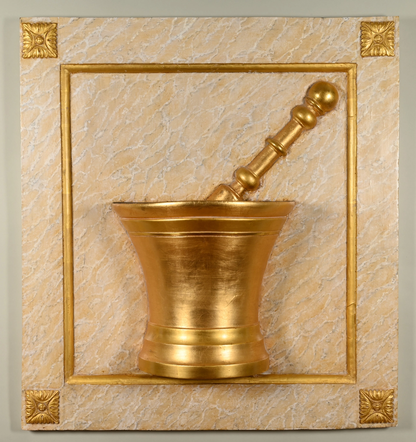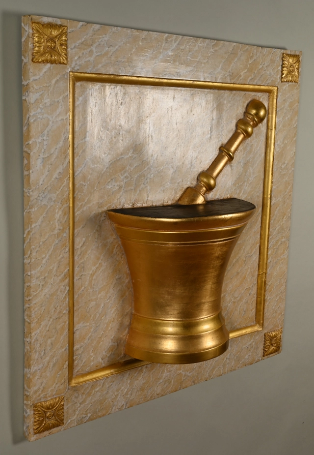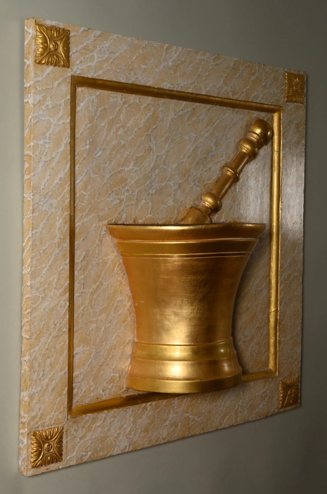 Dit grote bovenlicht, voor boven een buitendeur, is afkomstig uit de voormalige apotheek "de vergulde vijzel" in de Postelstraat in 's Hertogenbosch.