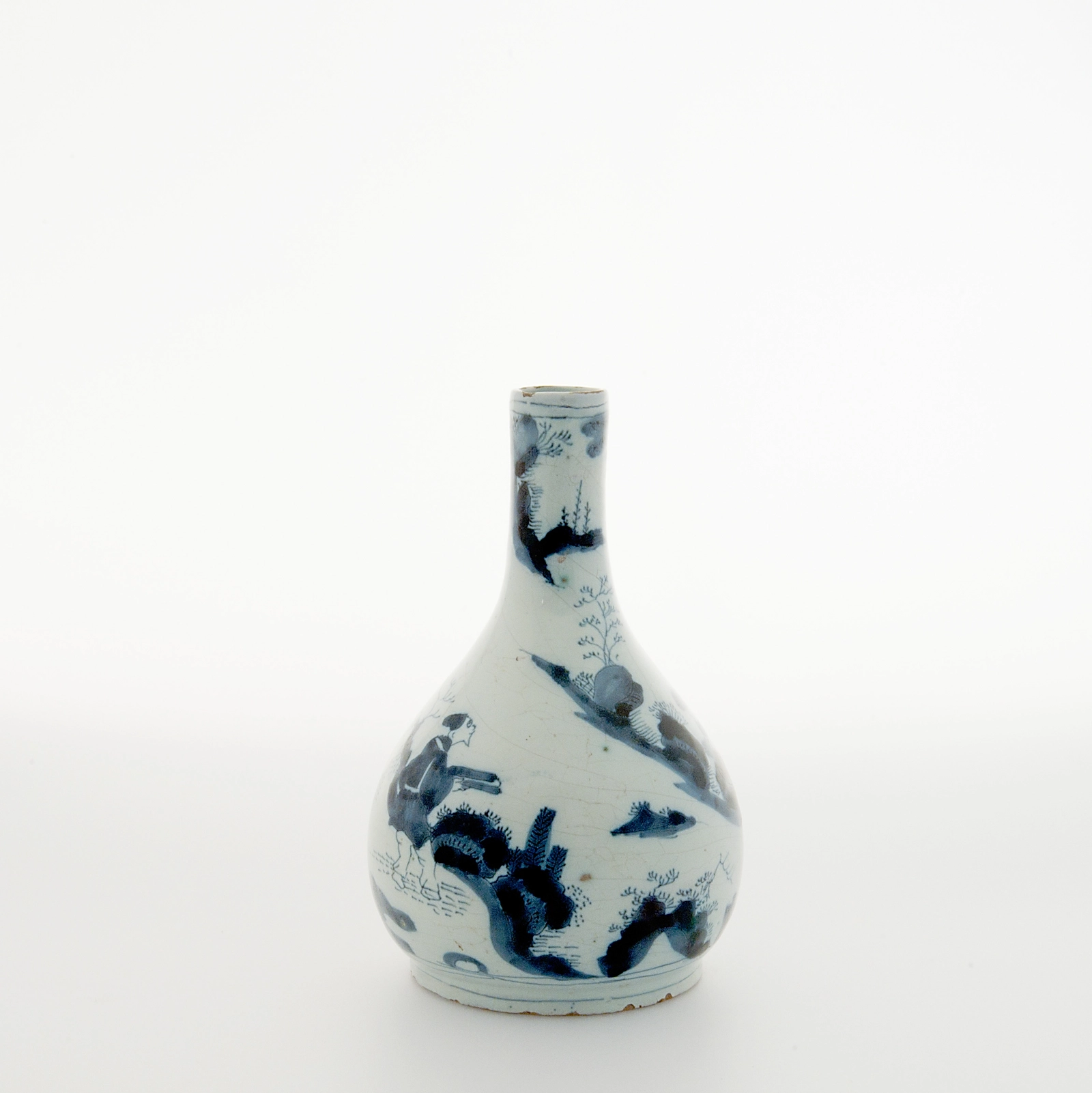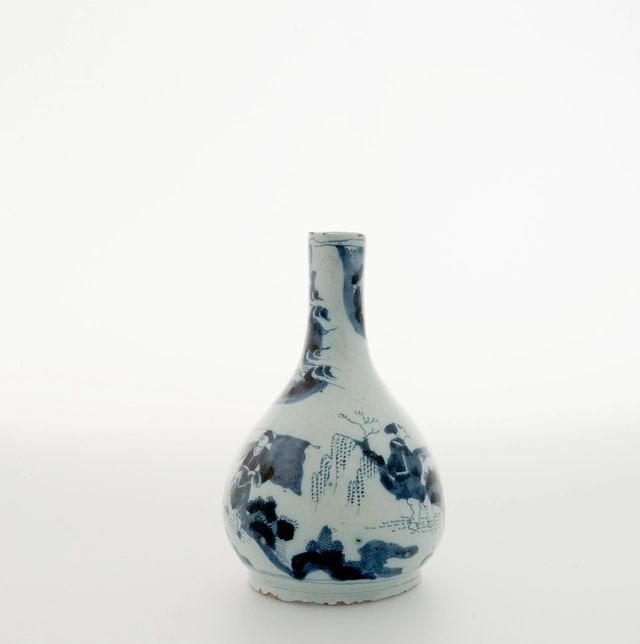 Het peervormige flesje met verwijdende hals toont een Orientaalse tuin met drie figuren. naar de stijlkenmerken van het Wanli porselein. Het vaasje is een prachtig voorbeeld van de vroeger productie van het tinglazuuraardewerk dat in Delft in de 17e eeuw werd ontwikkeld als Europese equivalent van het geliefde Chinese porselein.
