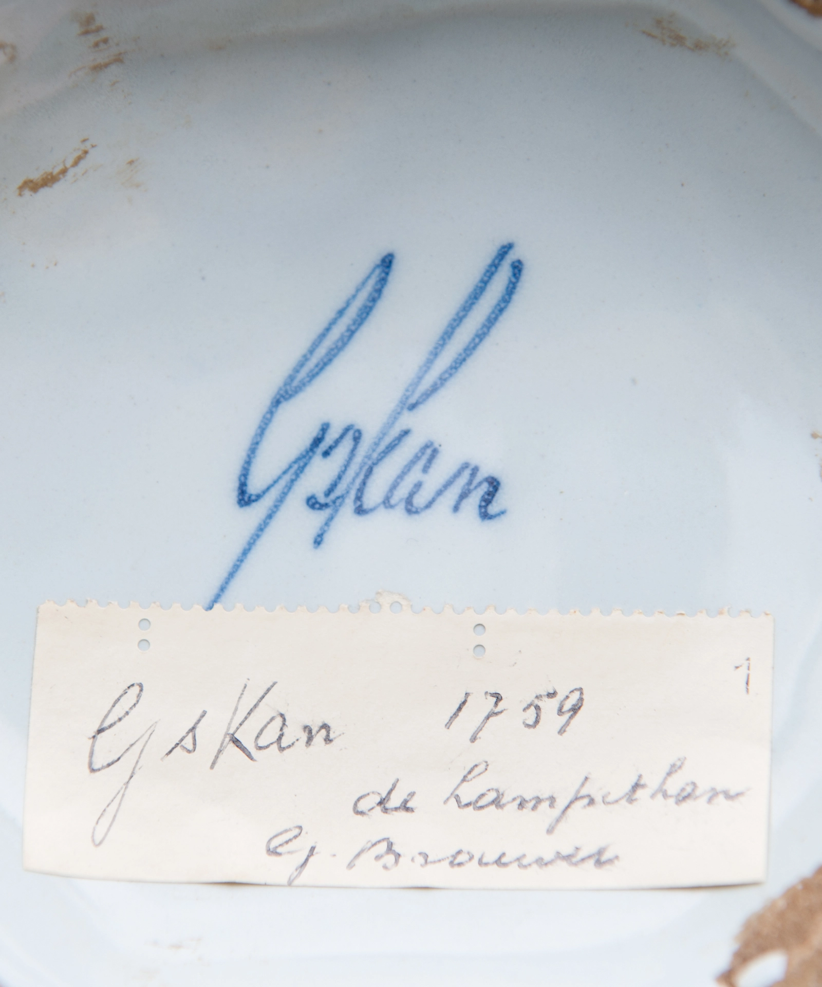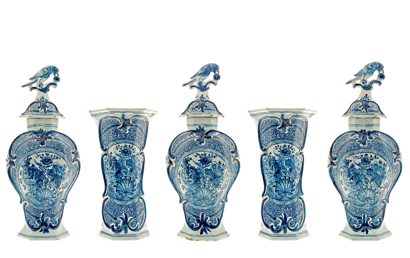 Een Blauw en Wit Vijfdelig Kaststel in Delfts Aardewerk