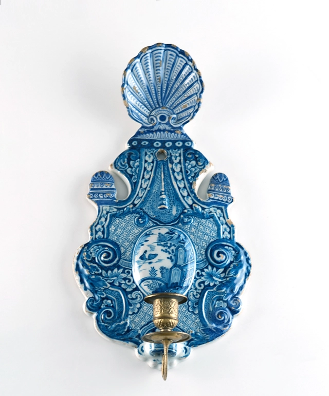 In het midden is een ovaal beschilderd met een Orientaalse scene. De plaque is bekroond met een schelp boven een gaatje om de plaque op te hangen. Onderaan is een blauwe lus met daarin een koperen kaarsenhouder.