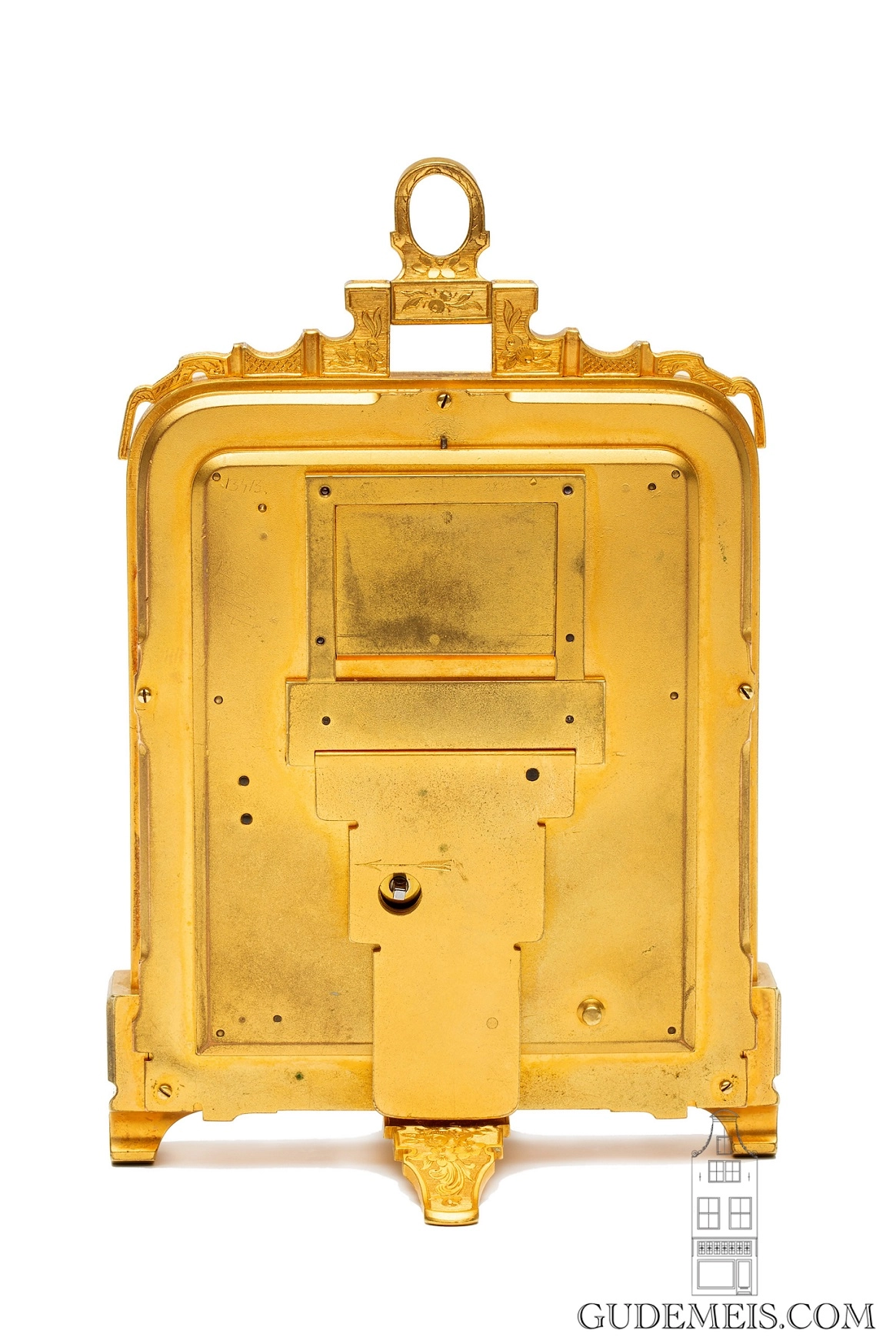 De rechthoekige verguld messing kast is vergelijkbaar met wijzerplaat geheel gegraveerd met bloemen en ranken. Op de kast is een scharnierbaar ophangoog aangebracht. Tussen de pootjes is een gegraveerd draaibaar voetje aangebracht waarmee het klokje verticaal neergezet kan worden. Aan de achterkant is een uitklapbare clip aangebracht waarmee het klokje schuin neergezet kan worden.