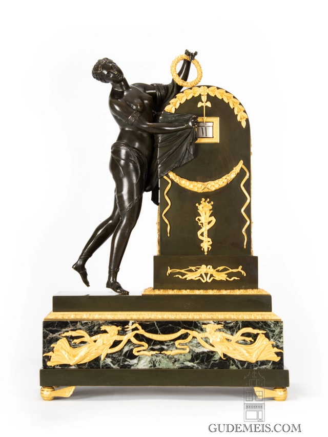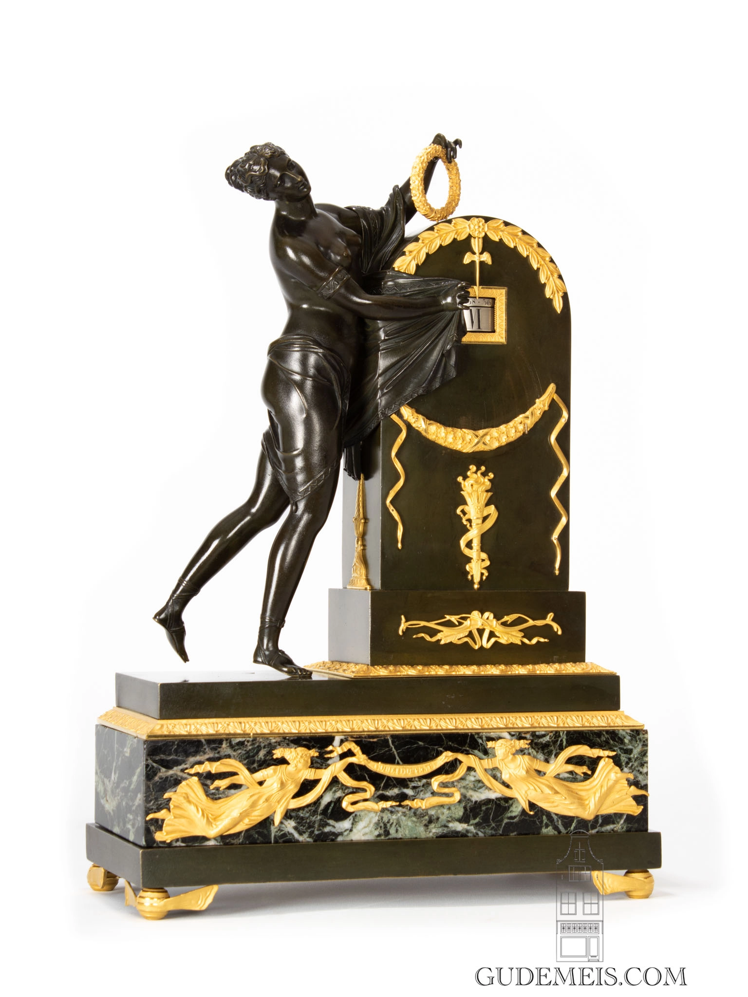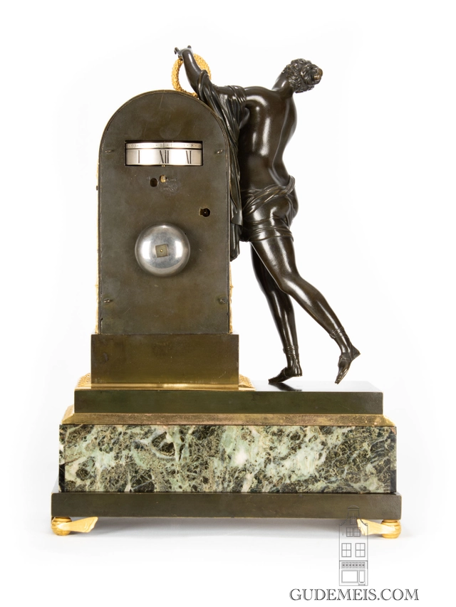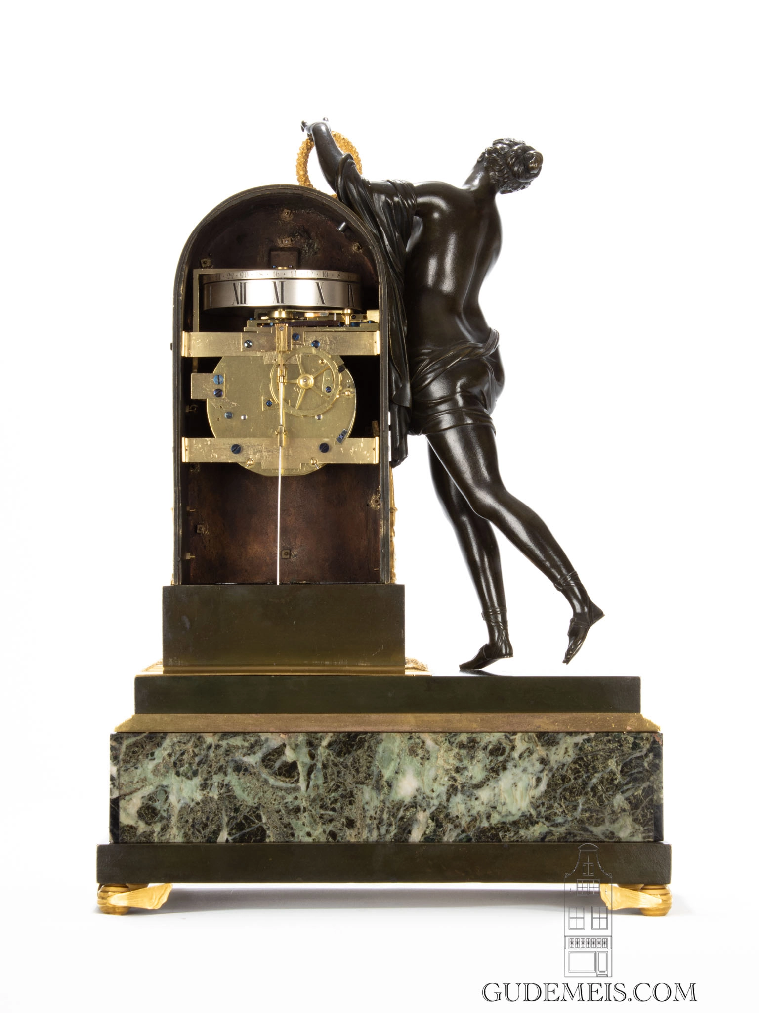 Dit model werd ontworpen door Simon-Louis Boizot en uitgevoerd door de beroemde bronzier Claude Galle. In 1806 werd het model voor het eerst getoond op de l’Exposition des Produits de l’Industrie. In hetzelfde jaar kreeg Napoléon Bonaparte een exemplaar cadeau dat nu in het Château Malmaison staat. Château Malmaison is het kasteel dat toebehoorde aan Napoleon I en zijn vrouw Joséphine de Beauharnais die het kocht in 1799. Claude Galle (1759-1815) wordt gezien als één van de beste ‘bronziers’ van het late Lodewijk XVI en Empire tijdperk. Zijn vakmanschap komt niet alleen tot uitdrukking in zijn kunstige ontwerpen maar ook in de kwaliteit van het bronswerk en de vergulding ervan. Naast de fantastische kwaliteit van het bronswerk zijn er de draaiende cijferringen die de klok nog interessanter maken. Een prachtig object en een speciale klok ineen.