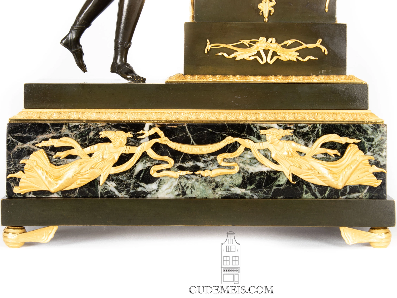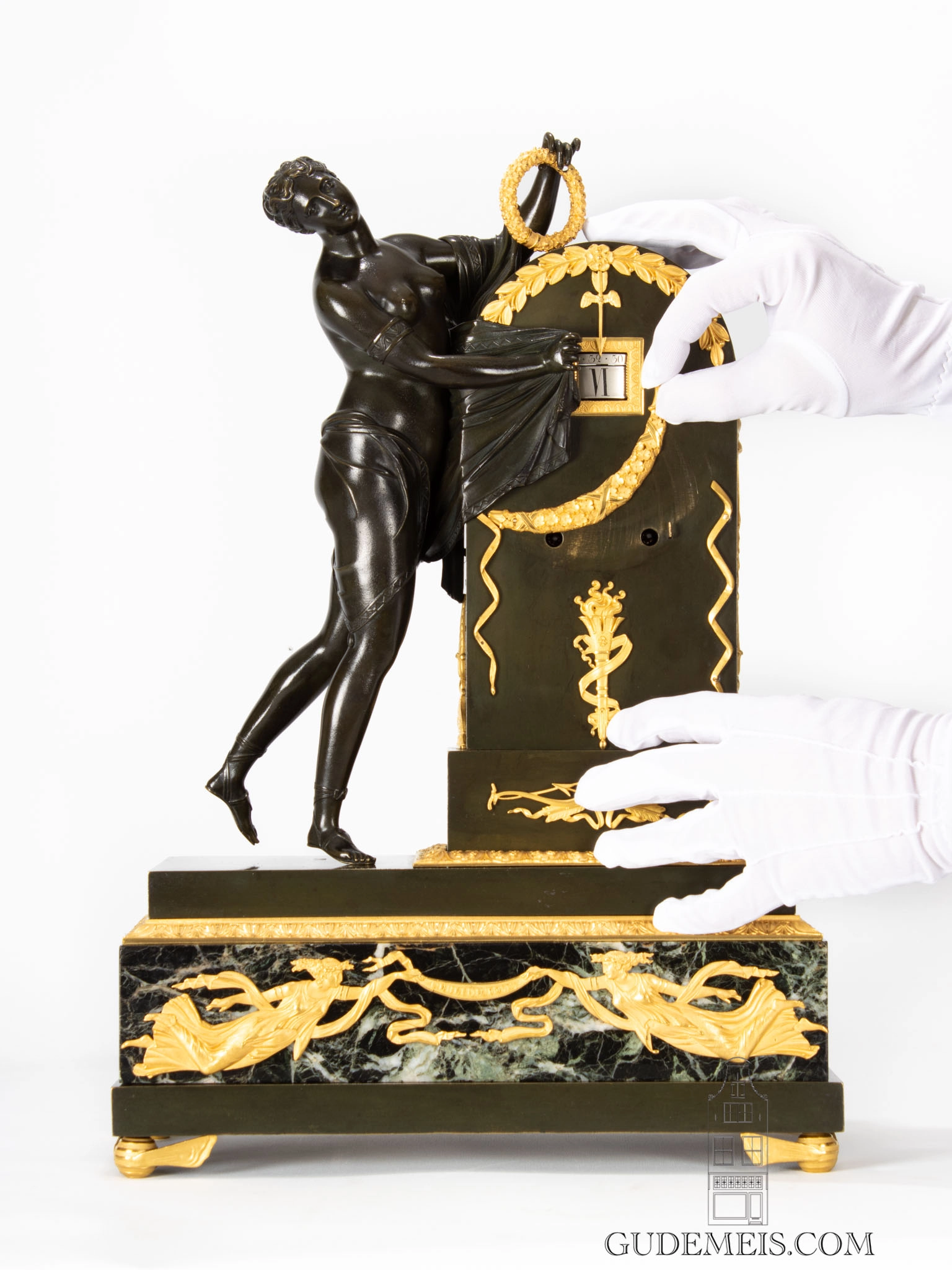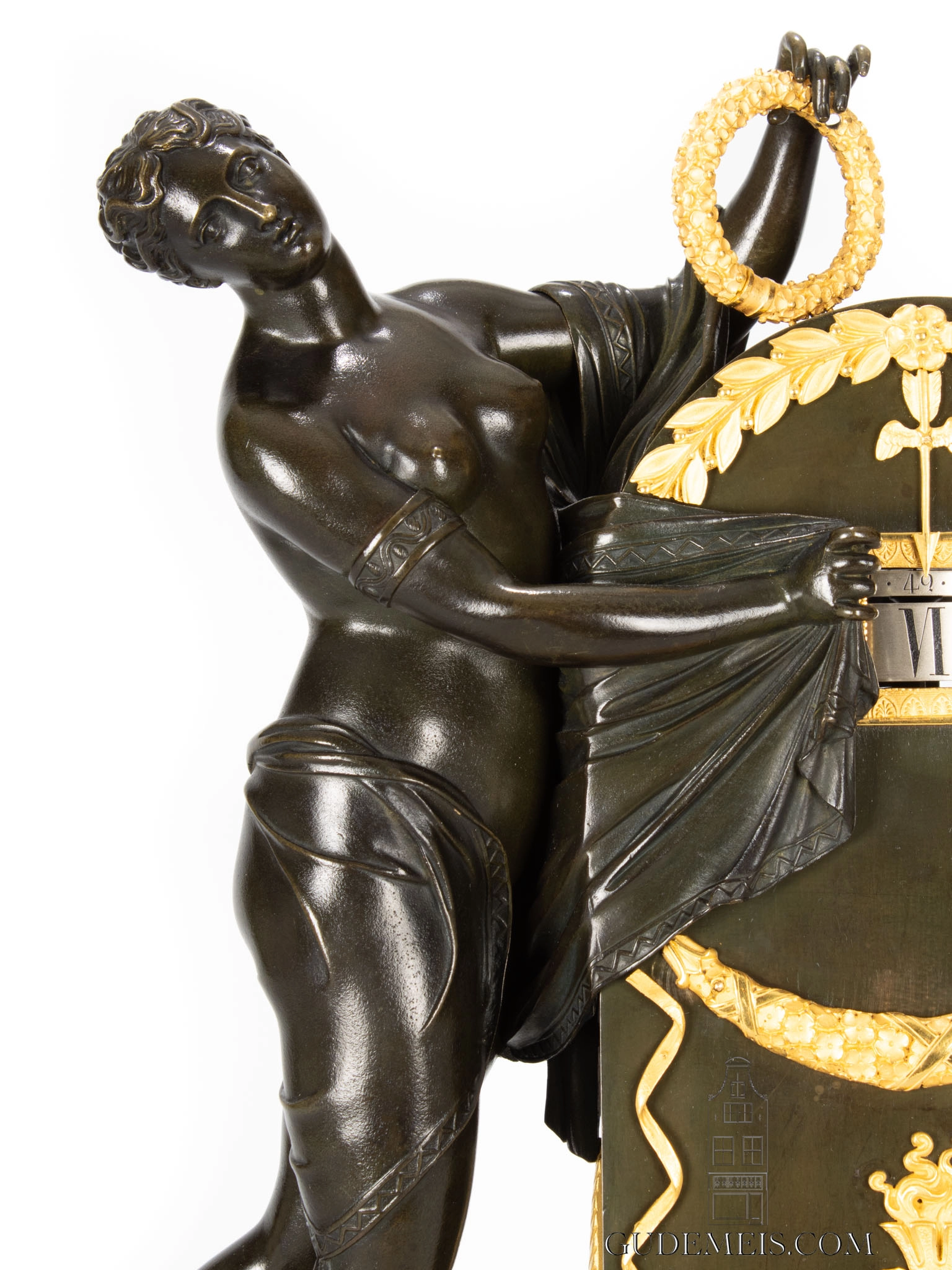 Dit model werd ontworpen door Simon-Louis Boizot en uitgevoerd door de beroemde bronzier Claude Galle. In 1806 werd het model voor het eerst getoond op de l’Exposition des Produits de l’Industrie. In hetzelfde jaar kreeg Napoléon Bonaparte een exemplaar cadeau dat nu in het Château Malmaison staat. Château Malmaison is het kasteel dat toebehoorde aan Napoleon I en zijn vrouw Joséphine de Beauharnais die het kocht in 1799. Claude Galle (1759-1815) wordt gezien als één van de beste ‘bronziers’ van het late Lodewijk XVI en Empire tijdperk. Zijn vakmanschap komt niet alleen tot uitdrukking in zijn kunstige ontwerpen maar ook in de kwaliteit van het bronswerk en de vergulding ervan. Naast de fantastische kwaliteit van het bronswerk zijn er de draaiende cijferringen die de klok nog interessanter maken. Een prachtig object en een speciale klok ineen.