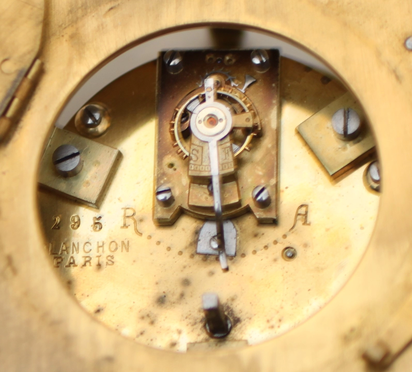 Een Franse verguld messing reisklok met porseleinen panelen, circa 1880