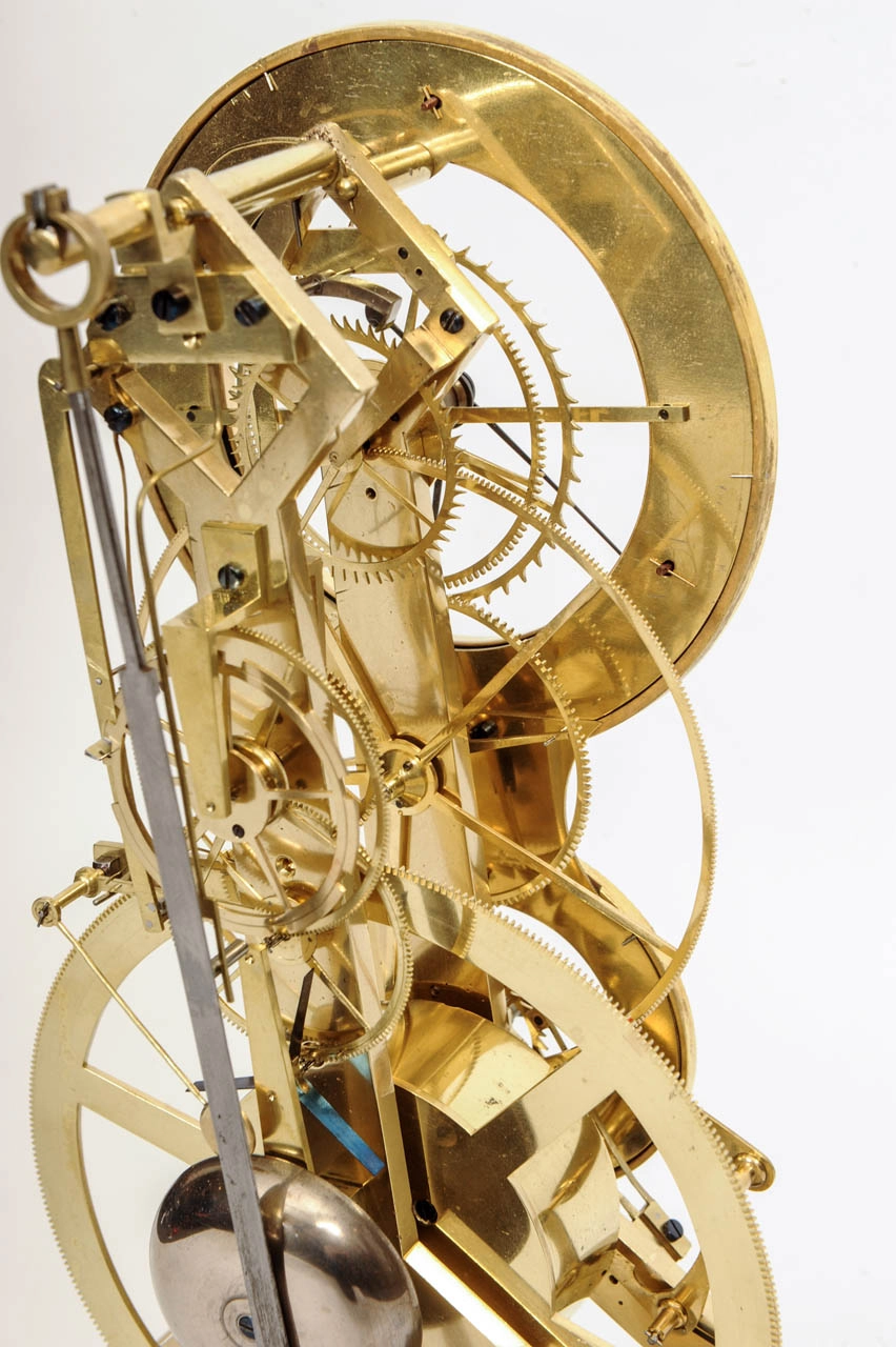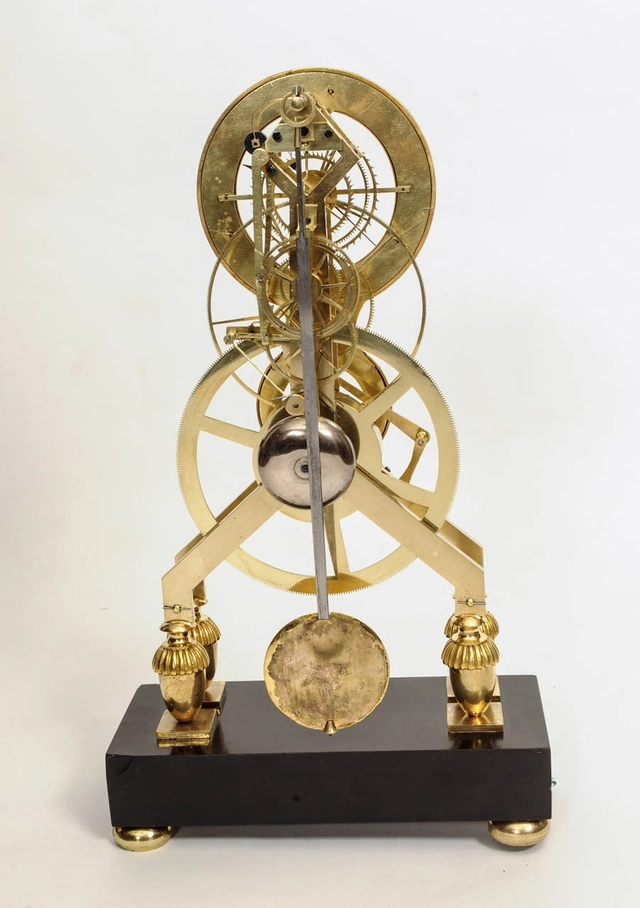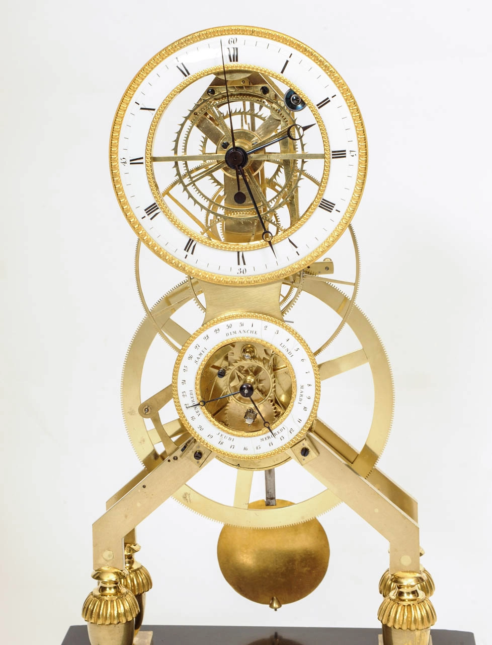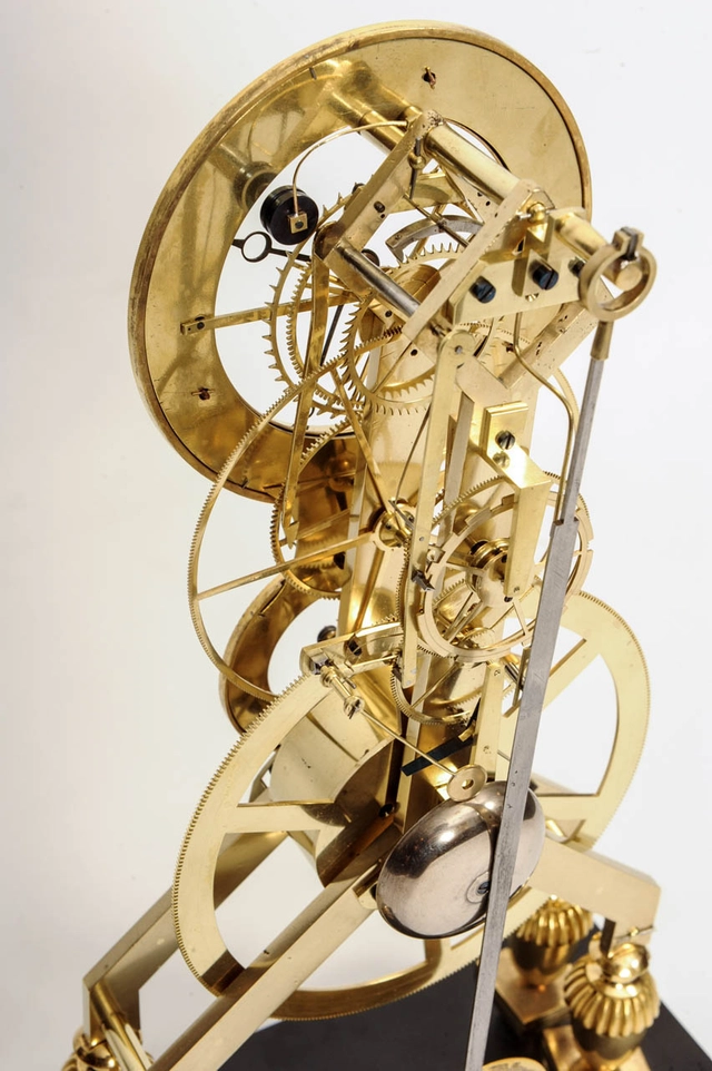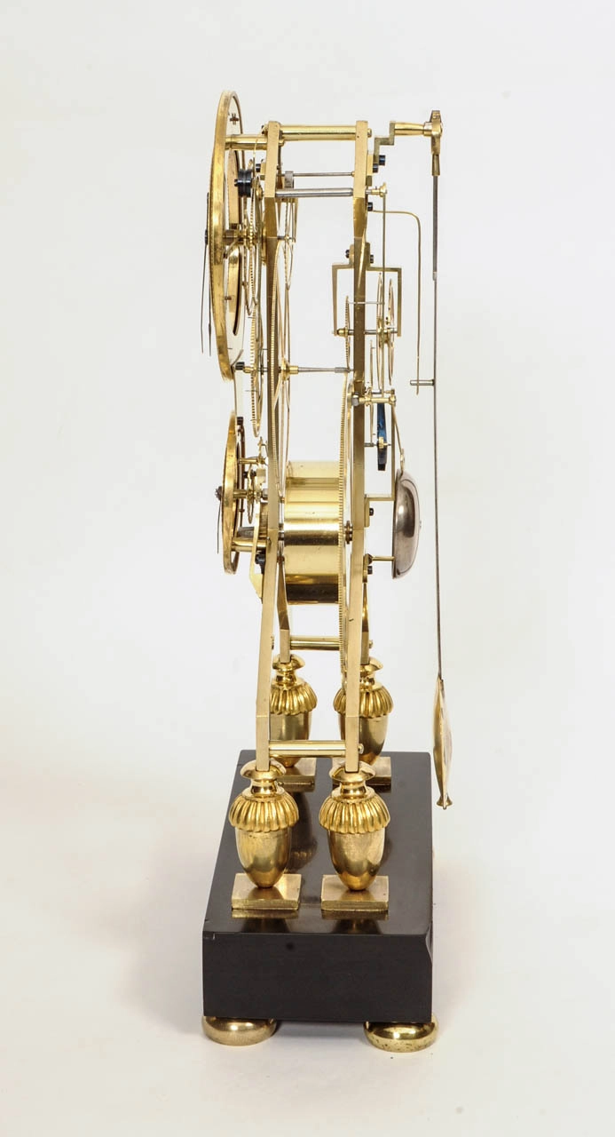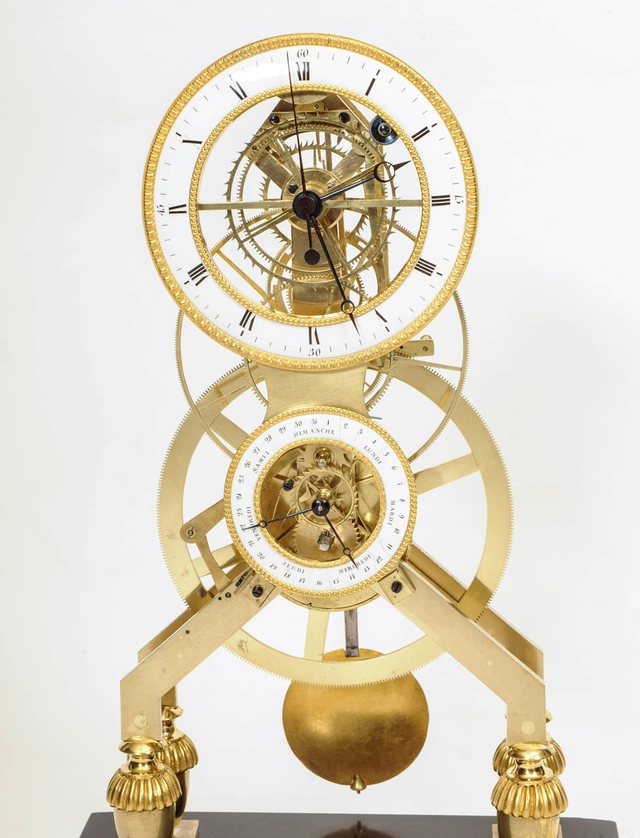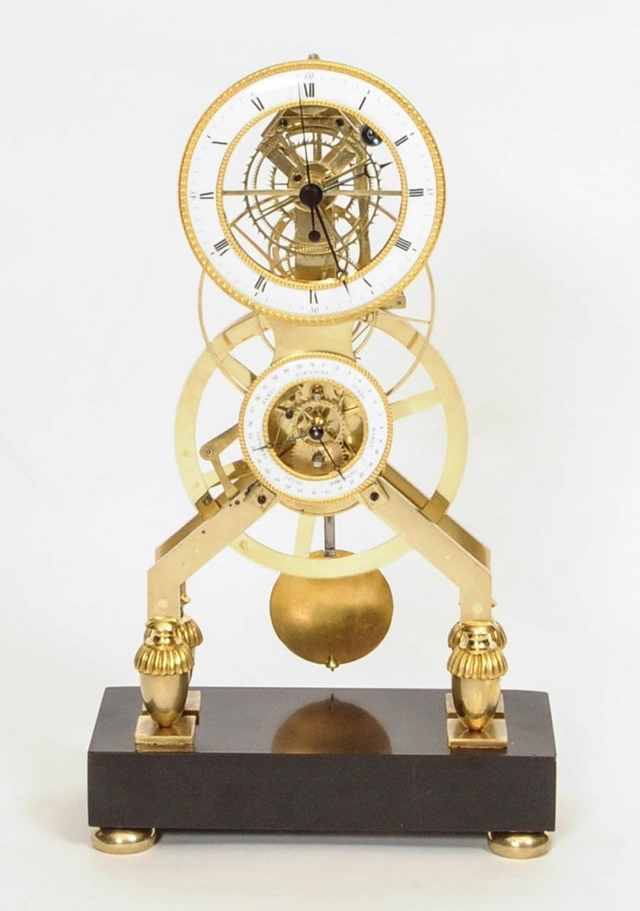 Een Franse Directoire vuurvergulde skeletpendule met email en kalender, Gaston Joly, circa 1795.