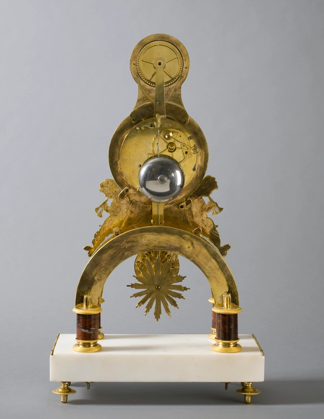 Een Franse Directoire messing en zwart marmeren skeletklok, omstreeks 1795