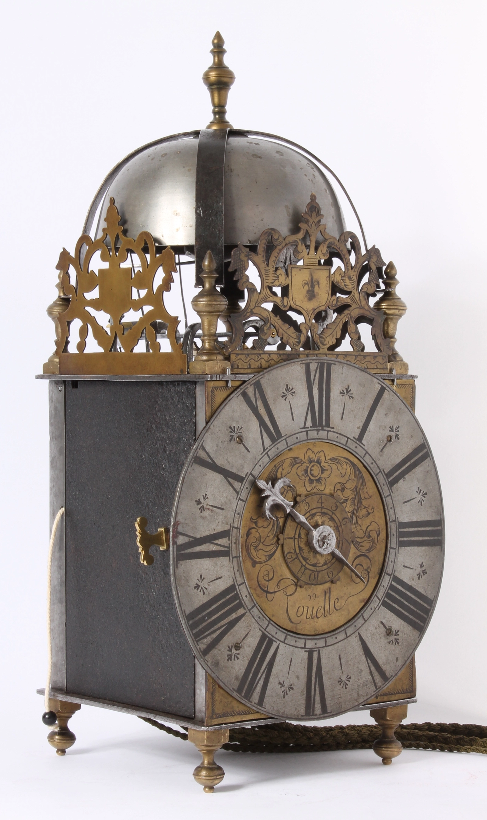 Een fraaie Franse messing lantaarnklok met slagwerk en wekker gesigneerd Rouelle A Bayeux, circa 1730