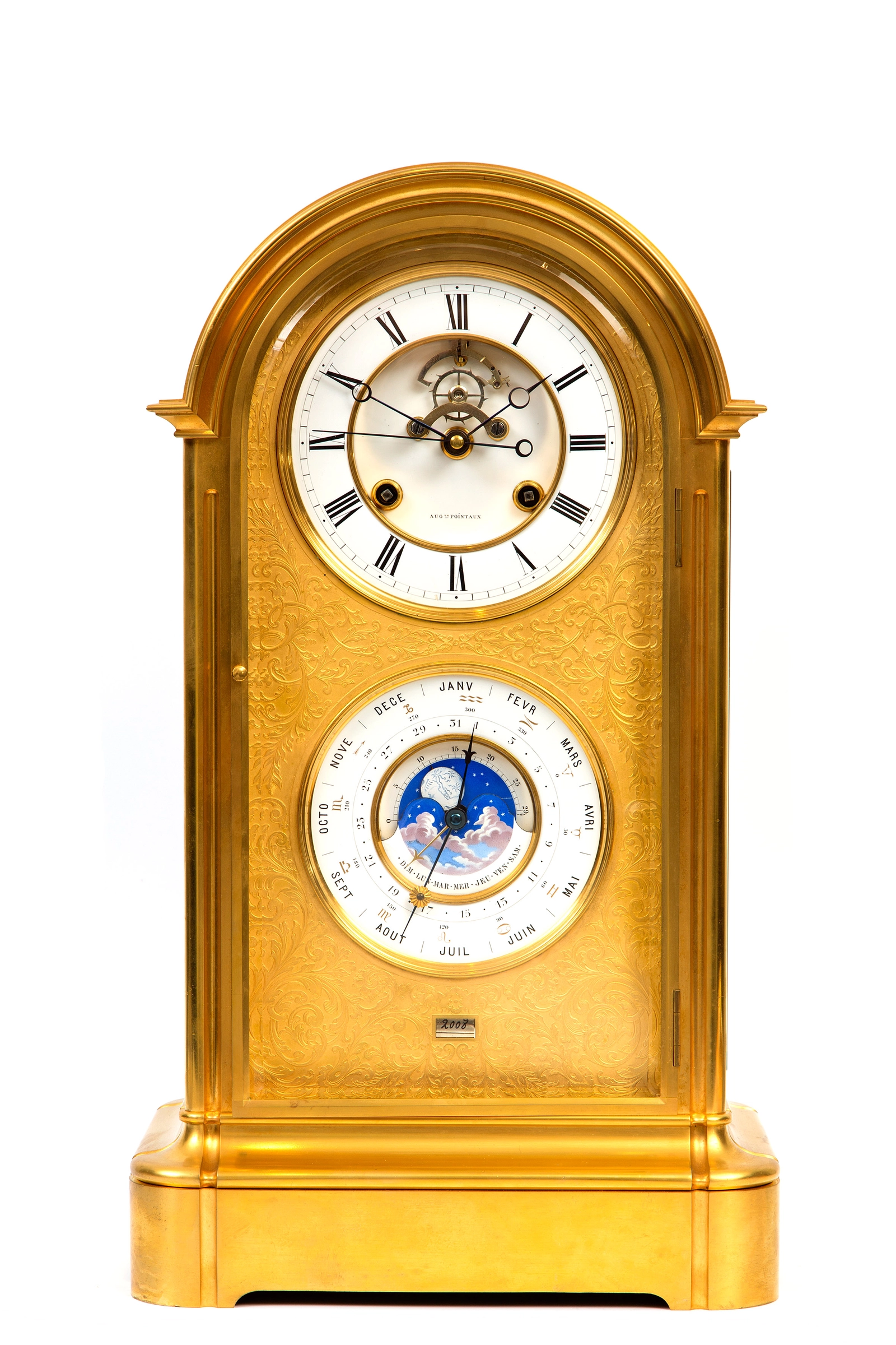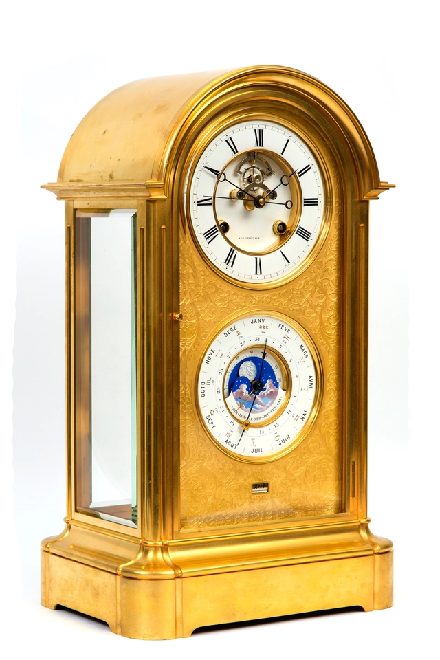 Een Franse messing tafelklok met Sèvres panelen en eeuwigdurende kalender, omstreeks 1880