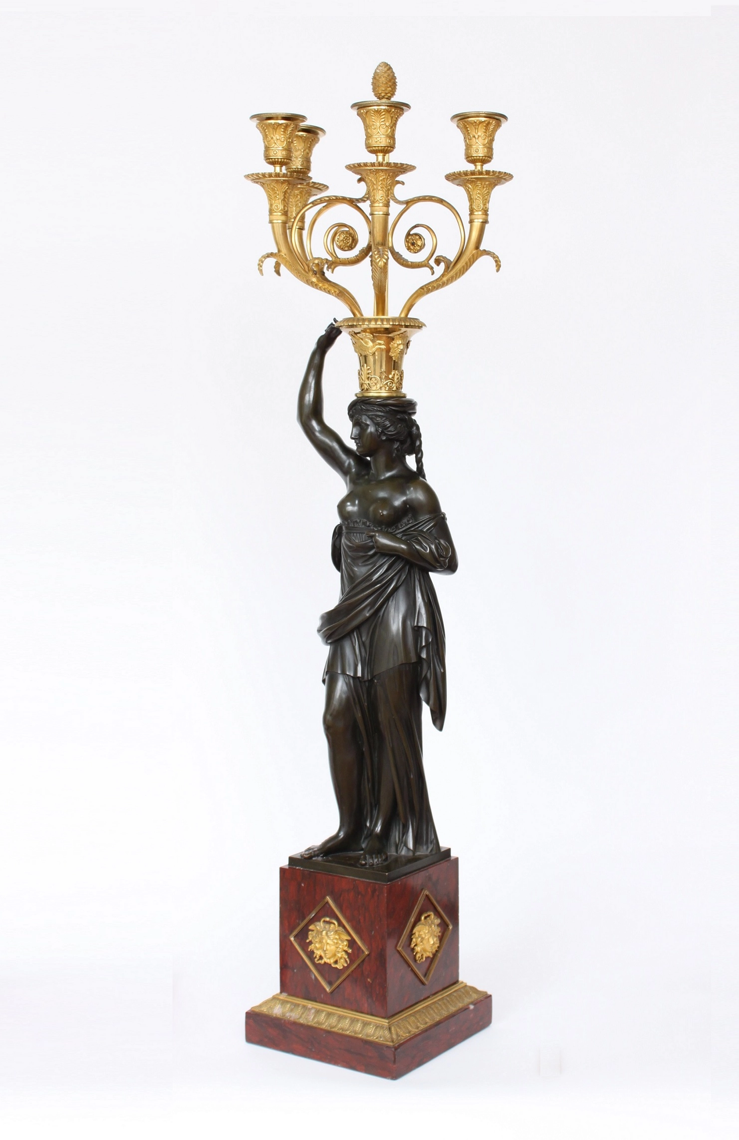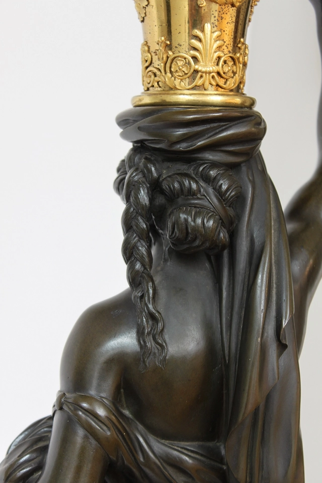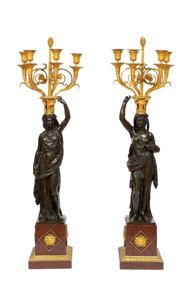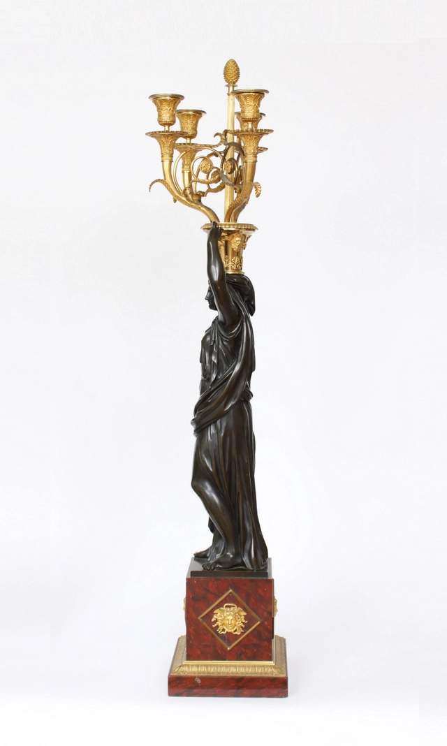 De twee zeer fraai gegoten en geciseleerde vrouwen figuren zijn ontworpen door François Remond circa 1785. Beide klassieke vrouwen zijn gevormd als klassieke karyatiden met gedrapeerde kleding. Met tegengestelde arm omhoog naar een vaasvorm met griffioenen en klassieke florale motieven. Hierop staand een gecannelleerde schacht bekroond door een denneappel en vier gebogen armen er omheen met de kaarsenhouders. Beide figuren staand op een vierkante griotte rouge marmeren voet met vergulde maskers en een fijn geciseleerde acanthusrand.