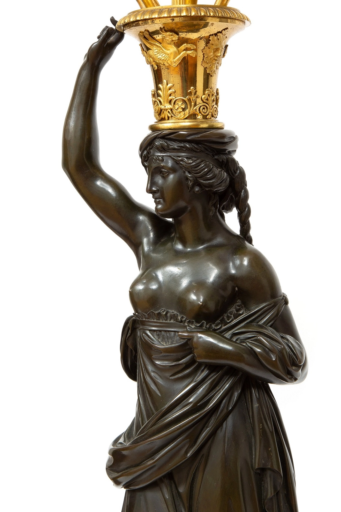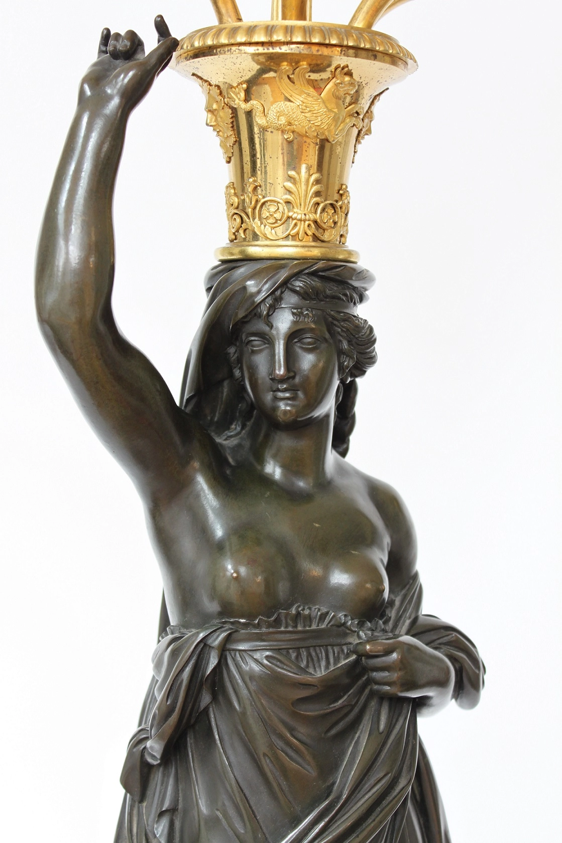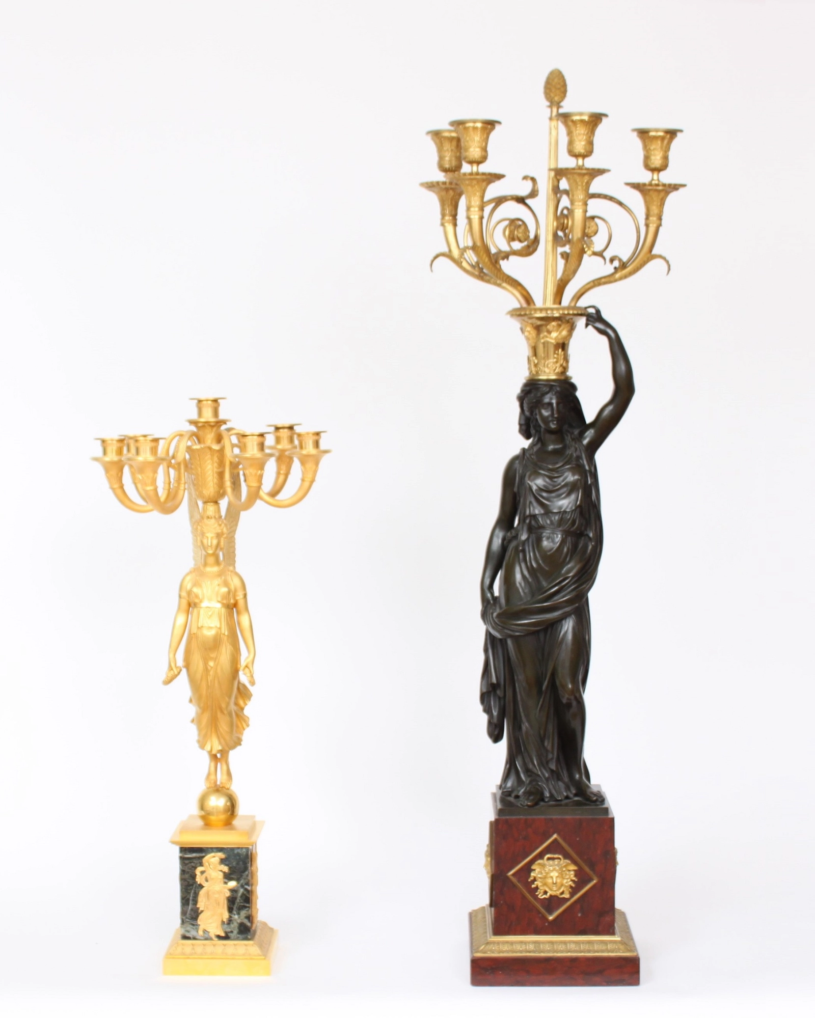 De twee zeer fraai gegoten en geciseleerde vrouwen figuren zijn ontworpen door François Remond circa 1785. Beide klassieke vrouwen zijn gevormd als klassieke karyatiden met gedrapeerde kleding. Met tegengestelde arm omhoog naar een vaasvorm met griffioenen en klassieke florale motieven. Hierop staand een gecannelleerde schacht bekroond door een denneappel en vier gebogen armen er omheen met de kaarsenhouders. Beide figuren staand op een vierkante griotte rouge marmeren voet met vergulde maskers en een fijn geciseleerde acanthusrand.