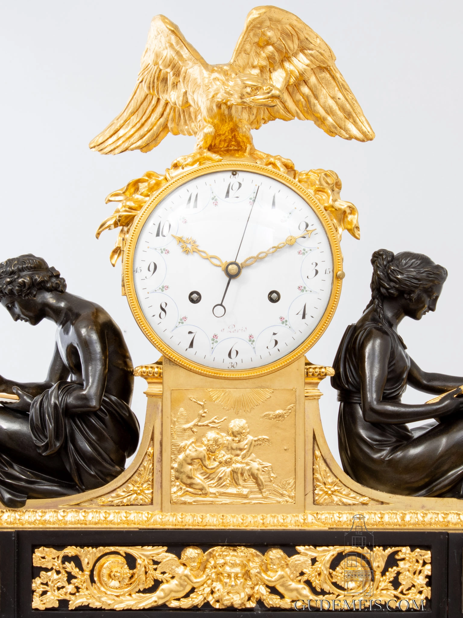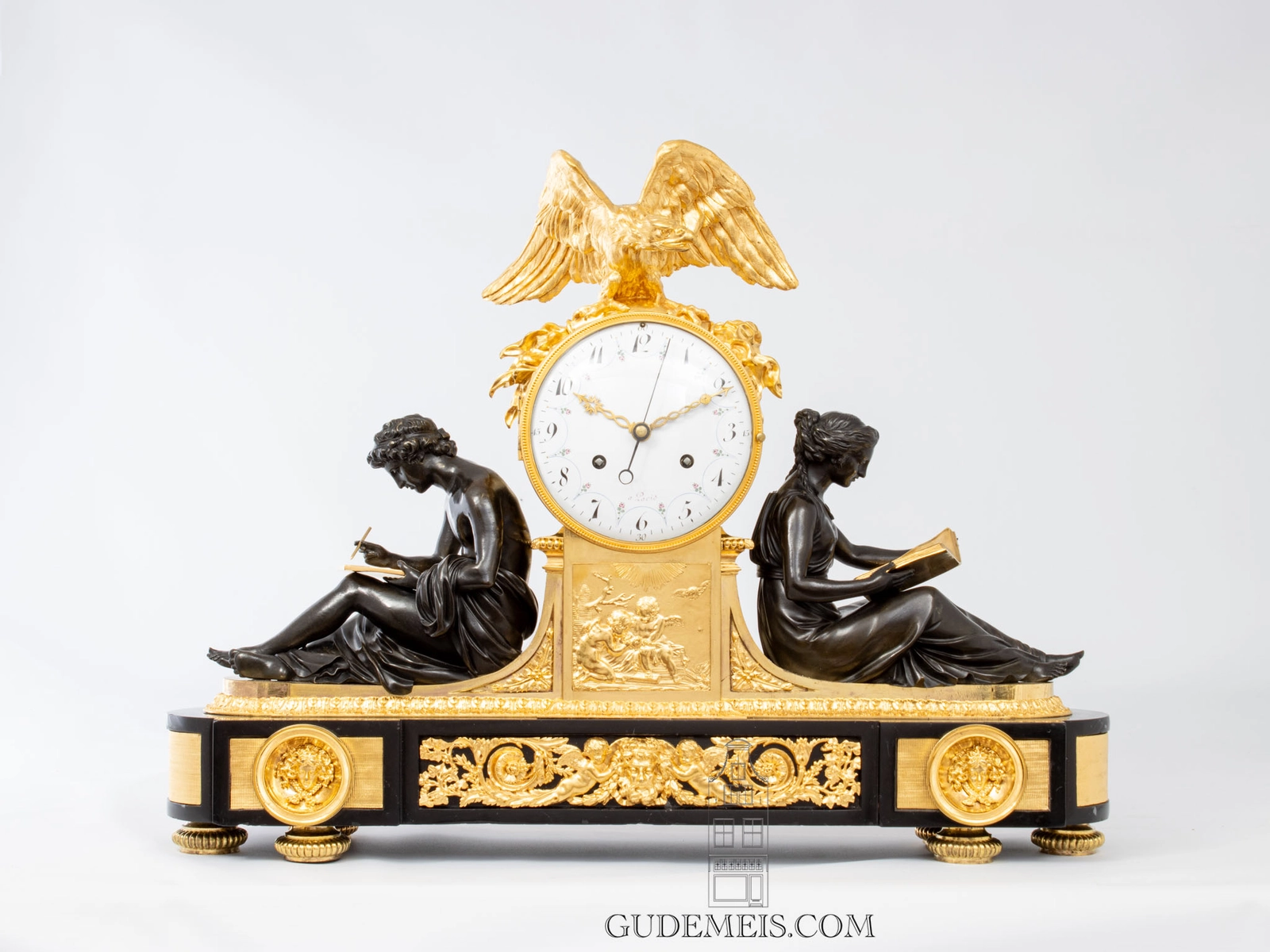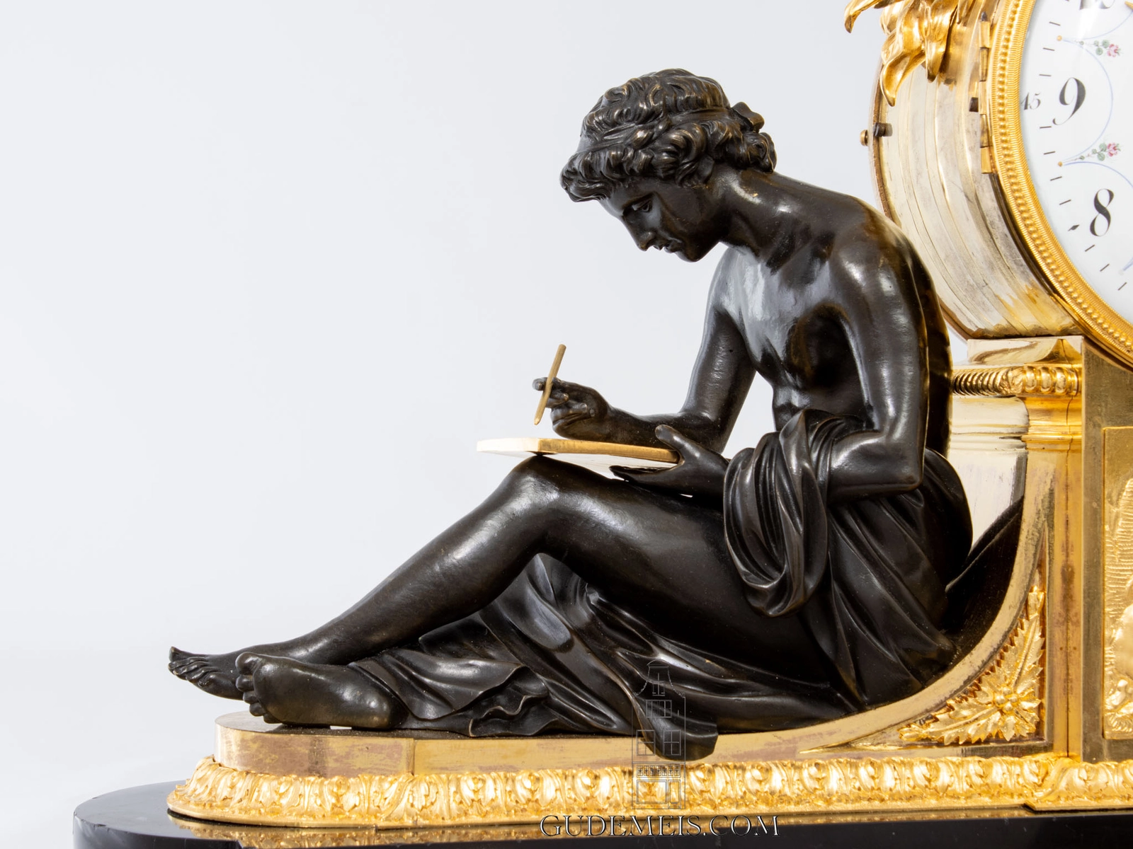 Het Classicisme tijdens de regeerperiode van Lodewijk XVI was geïnspireerd op de klassieke cultuur van de Oude Romeinen en Grieken. In de hogere kringen was het belangrijk bekend te zijn met de kunst, cultuur en filosofie om er bij te horen. Het is dan ook niet gek dat het bestuderen van de Antieken populair was en in hoog aanzien stond. De twee klassieke figuren, een schrijvende man en een lezende vrouw personifiëren ‘Study’ en ‘Filosofie’. Het ontwerp van deze klok is gemaakt door François Rémond, maar hij is niet de schepper van de twee figuren. Die werden enkele jaren eerder ontworpen door andere bekende kunstenaar, Simon-Louis Boizot. Beide figuren komen ook voor als pendanten op andere kunstvoorwerpen in zowel brons als porselein. Het ontwerp door Rémond van deze klok is nog bekend. Zowel in thema als in vormentaal is dit een fraai voorbeeld van het Classicisme van Lodewijk XVI in toegepaste kunst. Daarbij is het bronswerk en de vergulding van de hoogste kwaliteit, een bewijs van de kunde van de Franse ambachtslieden van de late 18e eeuw.