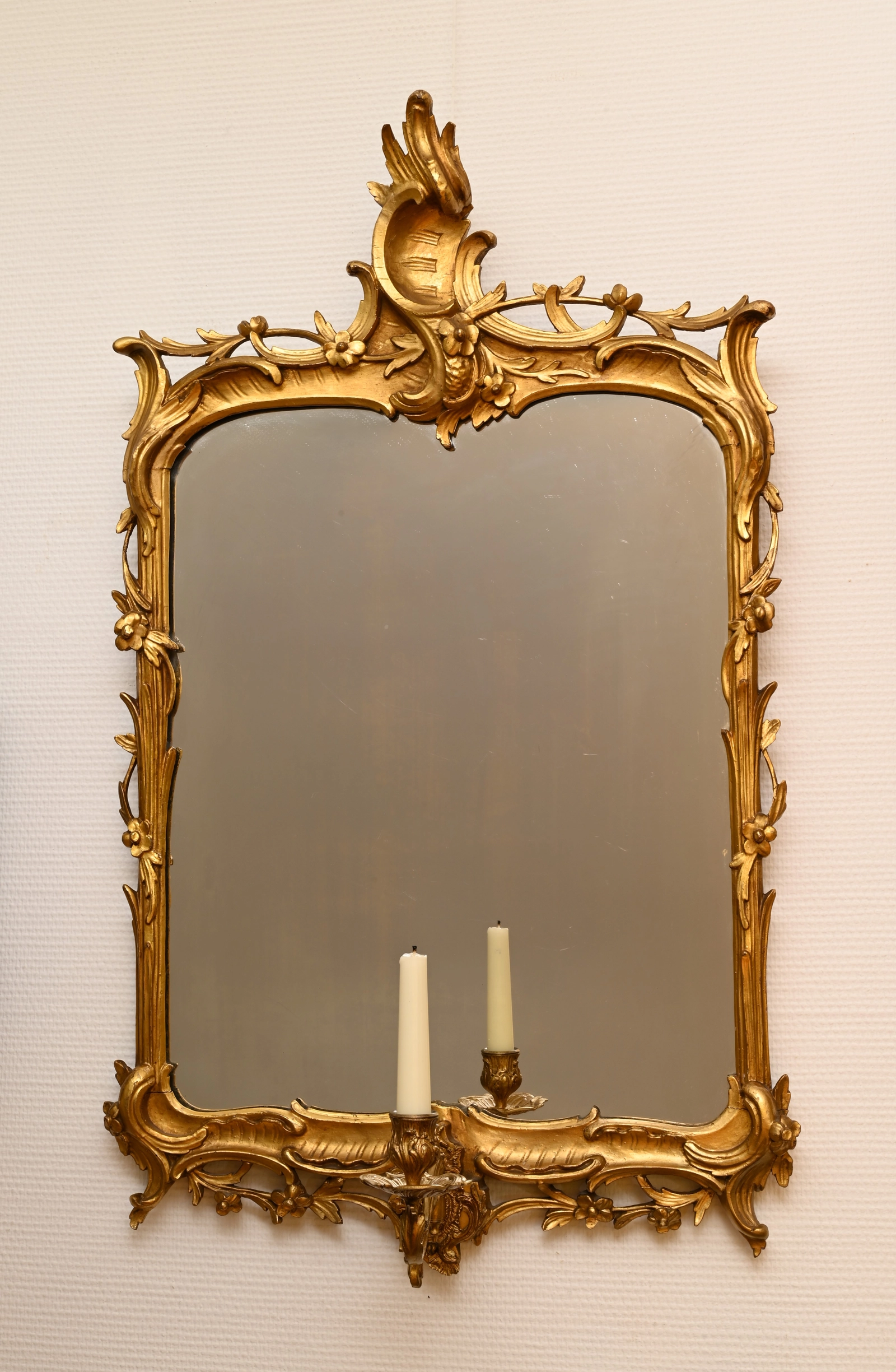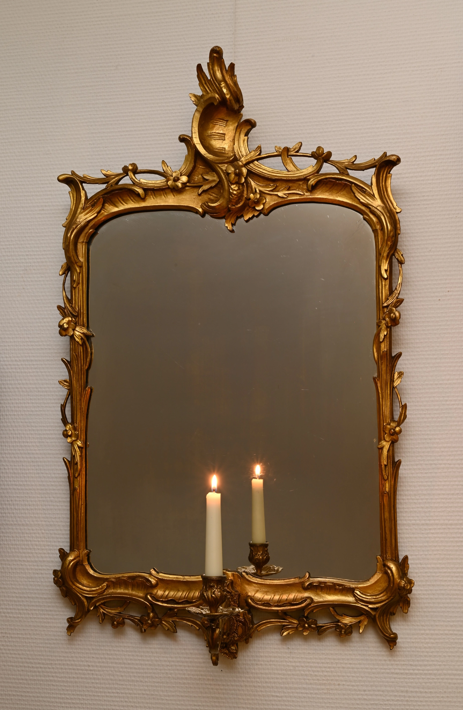 De spiegel heeft nog steeds zijn originele kaarsen houder, ook met rococo motieven.