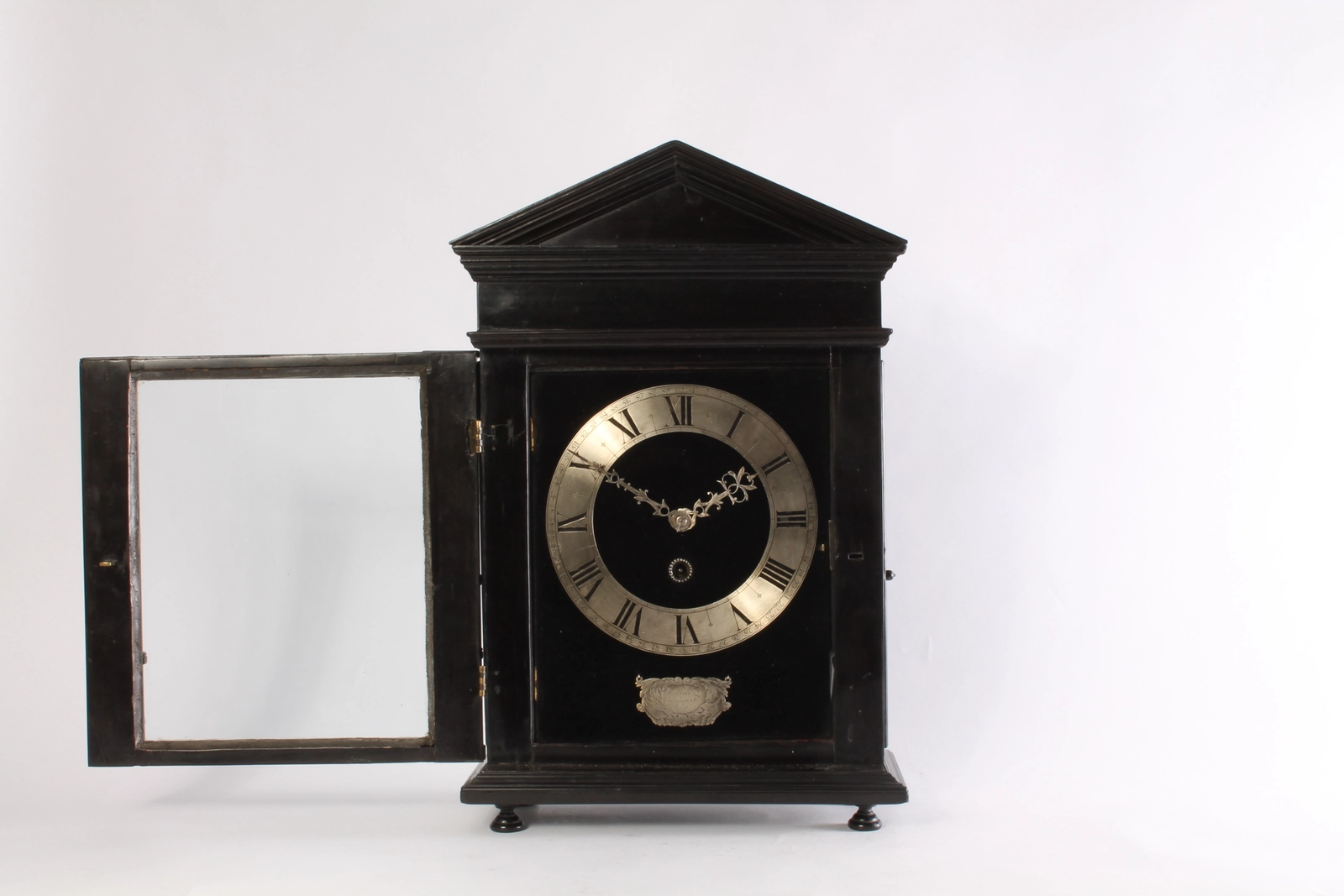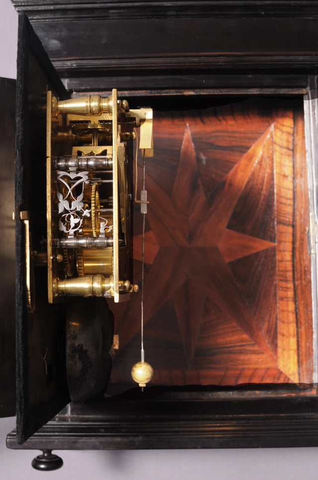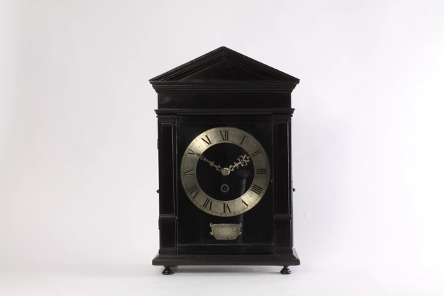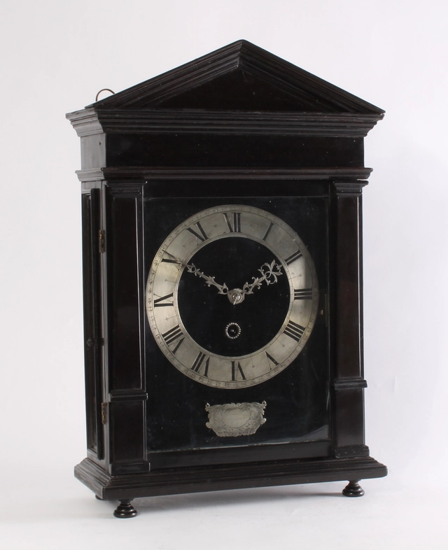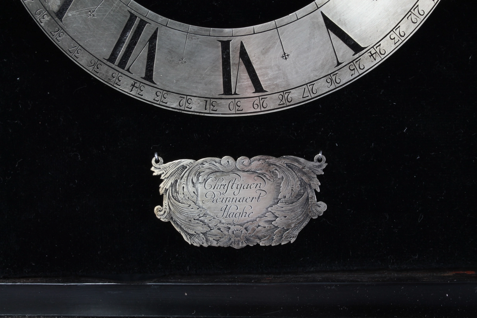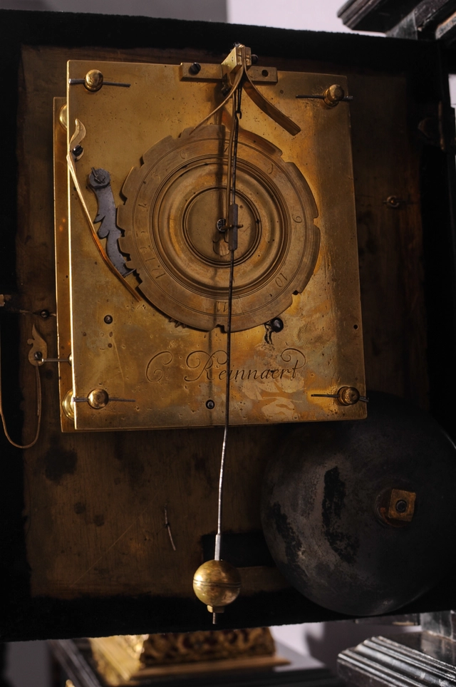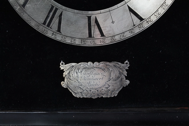 Een Hollandse gezwarte tafelklok met datum, dag en maanfase, door J.P. Kroese, omstreeks 1740