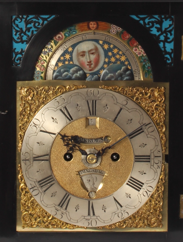 Een zeer zeldzame Hollandse wortelnoten staande klok met planisferium, Andries Vermeulen Amsterdam, circa 1730.