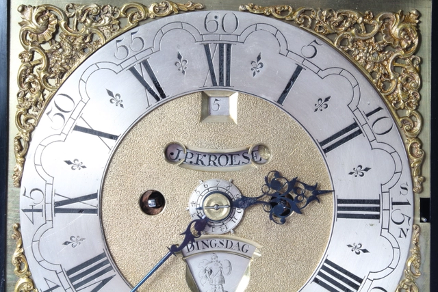 Een mooie Hollandse wortelnoten staande klok J P Kroese Amsterdam circa 1735