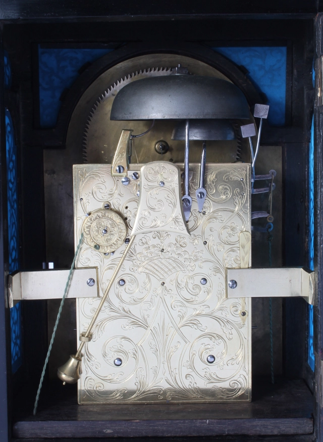 Een Hollandse wortelnoten staande klok met speelwerk, door Gerrit Storm, omstreeks 1735