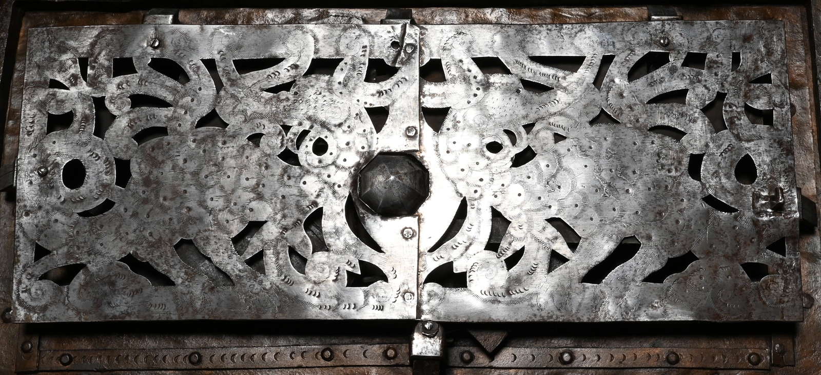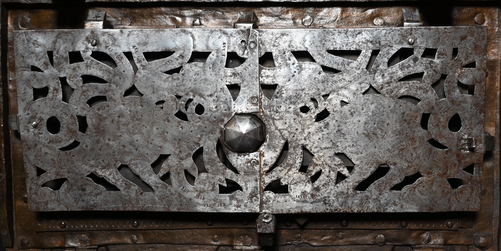 Het sluitmechanisme werd aan de binnenkant afgedekt met een uitgezaagde en gegraveerde afdekplaat.