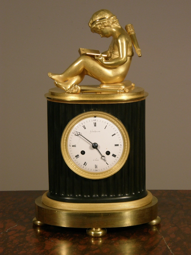 Een kleine Engelse gezwarte tafelklok met maanfase, door Robert Wood, omstreeks 1770