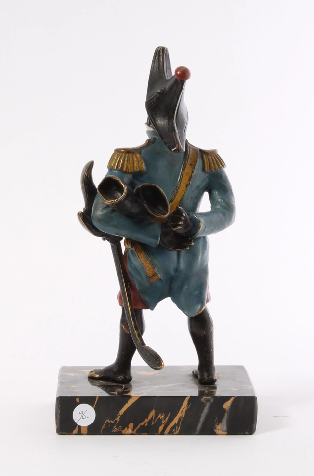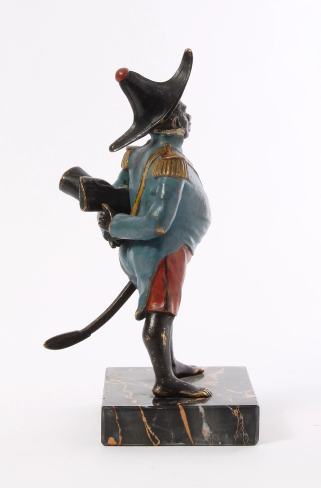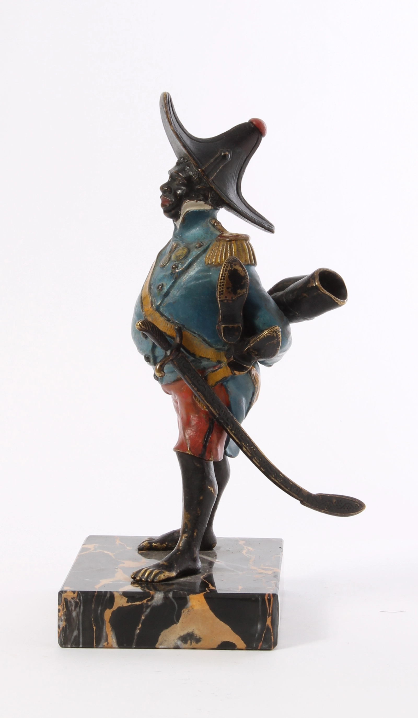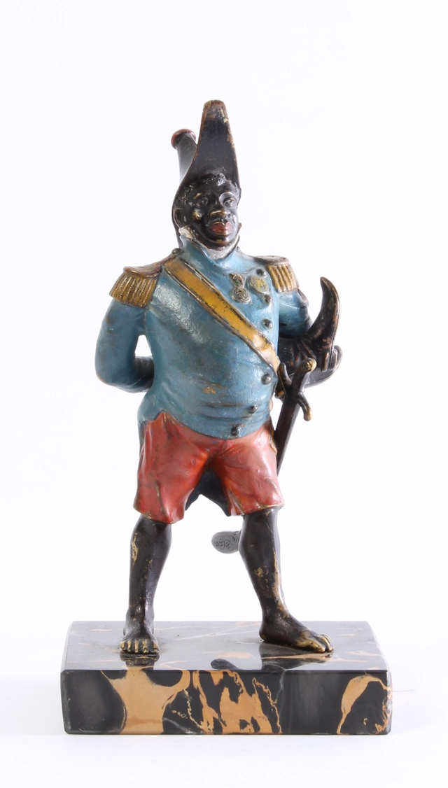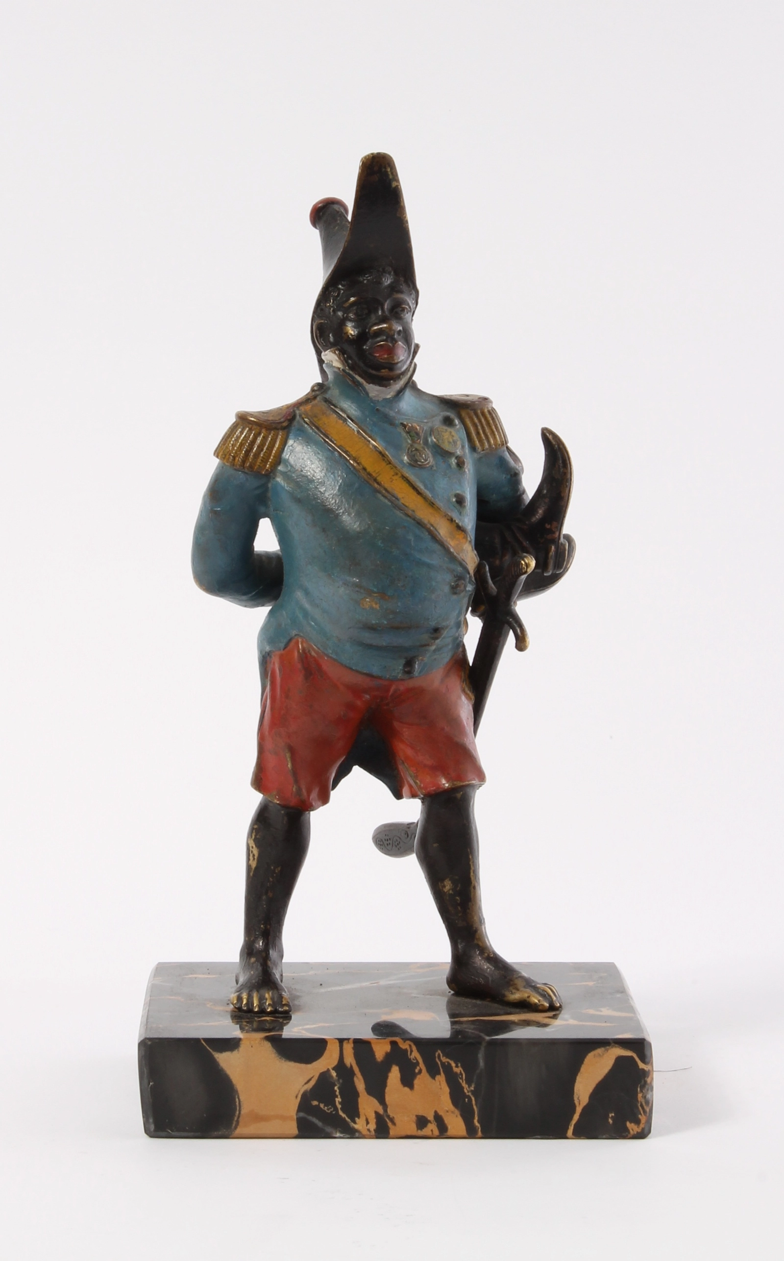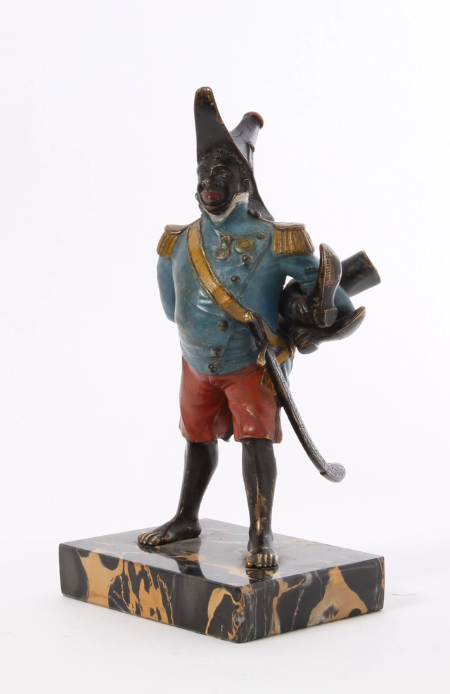 Een koud beschilderd bronzen figuur van generaal Toussaint-Louverture op portor marmeren voet, omstreeks 1880